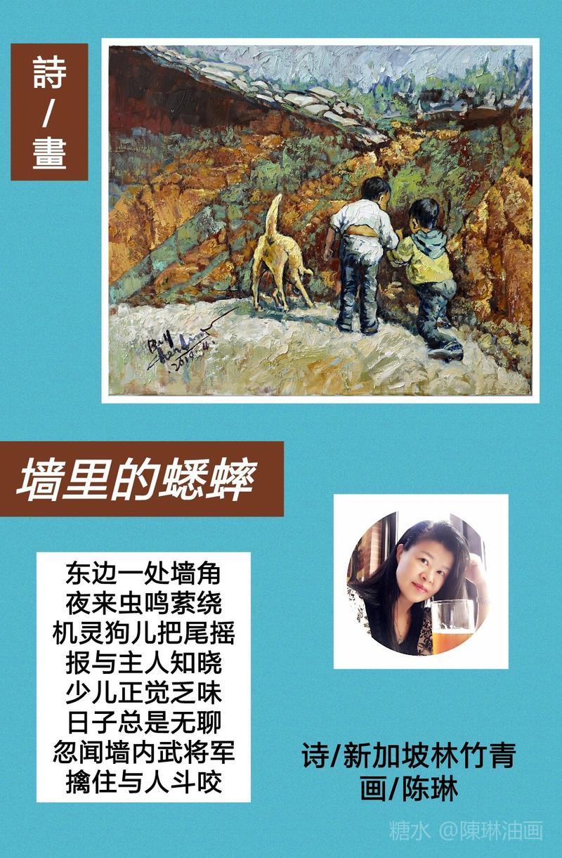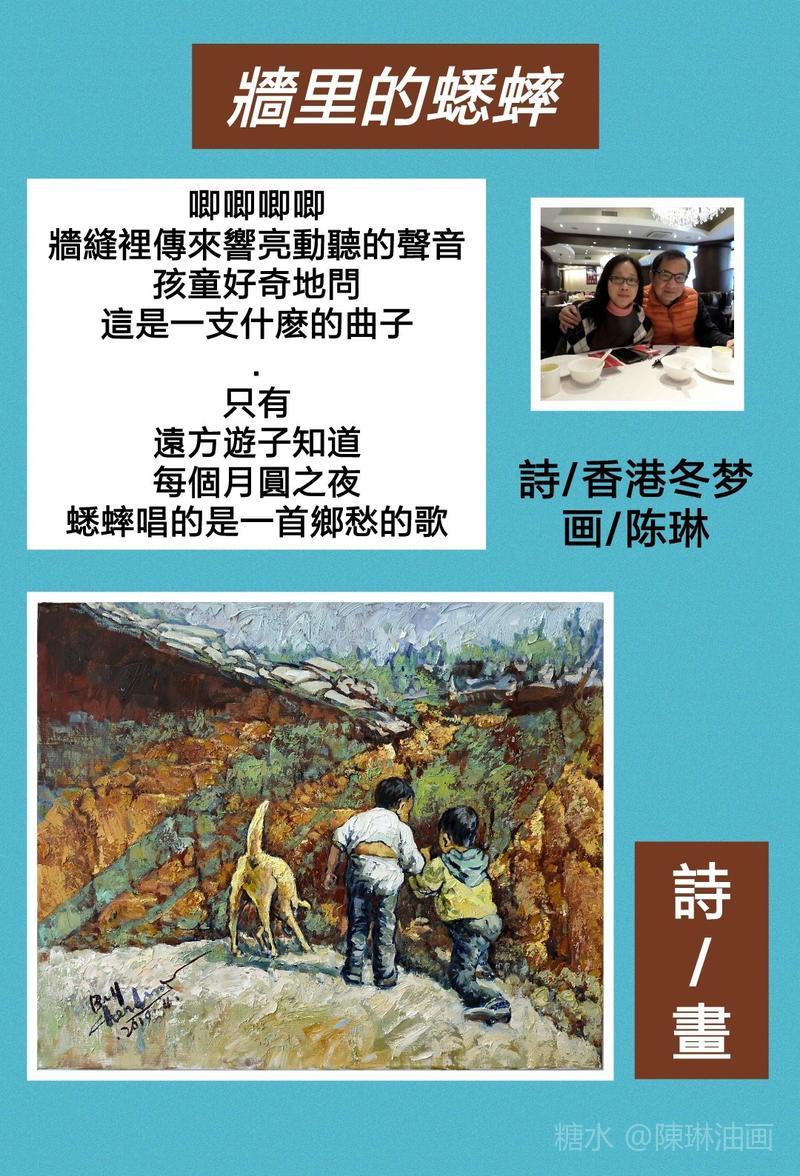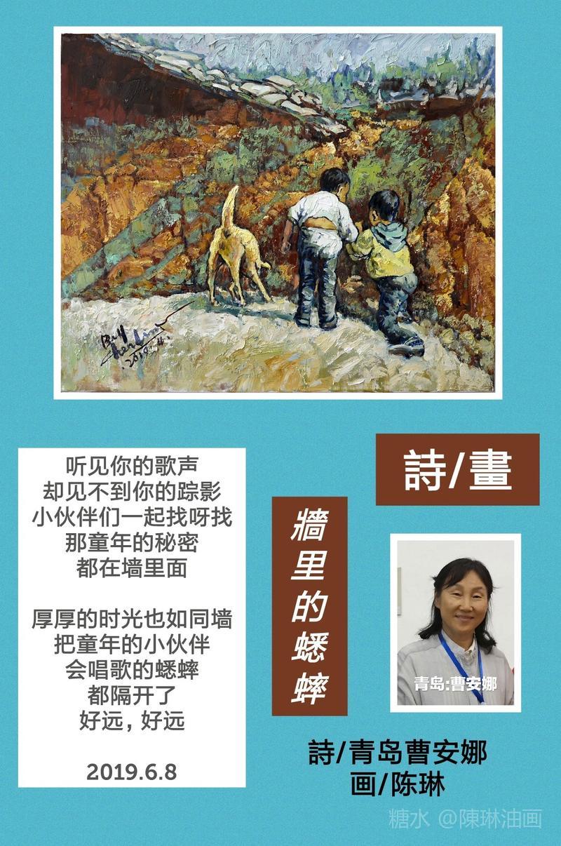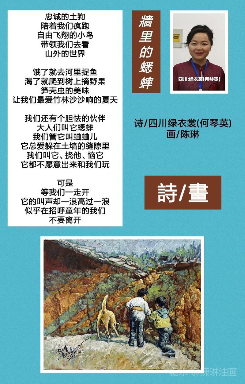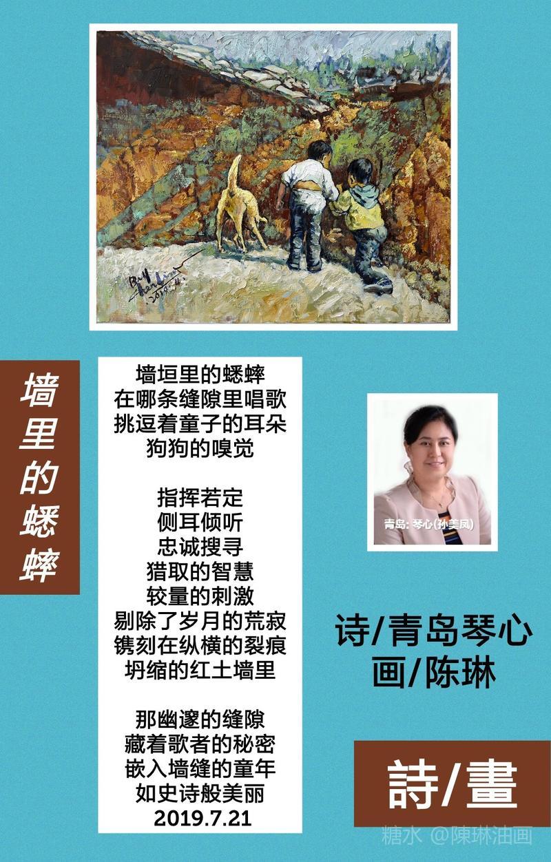 布面油画《墙里的蟋蟀》 作者:陳琳 规格:53*65cm 《墙里的蟋蟀》 作者:陈琳 忏悔的春风将太阳拉成细长 破落的斷垣传出亘古的亮嗓 是谁在歌唱? 一个凄美的故事在风中凌乱 碧空蒼茫,血色残陽 红土墙里有一个人间天堂 时光清浅,鲜花浪漫 西山日斜尽篇章 是谁把乡愁捧在手上 看在眼里有几多愁惆 抓住了远方星空浩瀚 我们就要出发追赶太阳 蟋蟀还在弹唱,琴声潺潺漫漫 野花谢过村庄,没有太多情伤 当画中月儿从树上熟落 你才会静谧于甜蜜梦乡