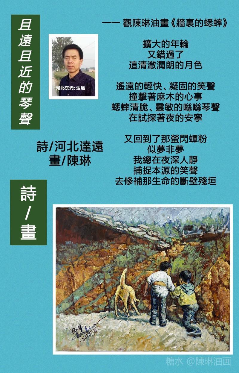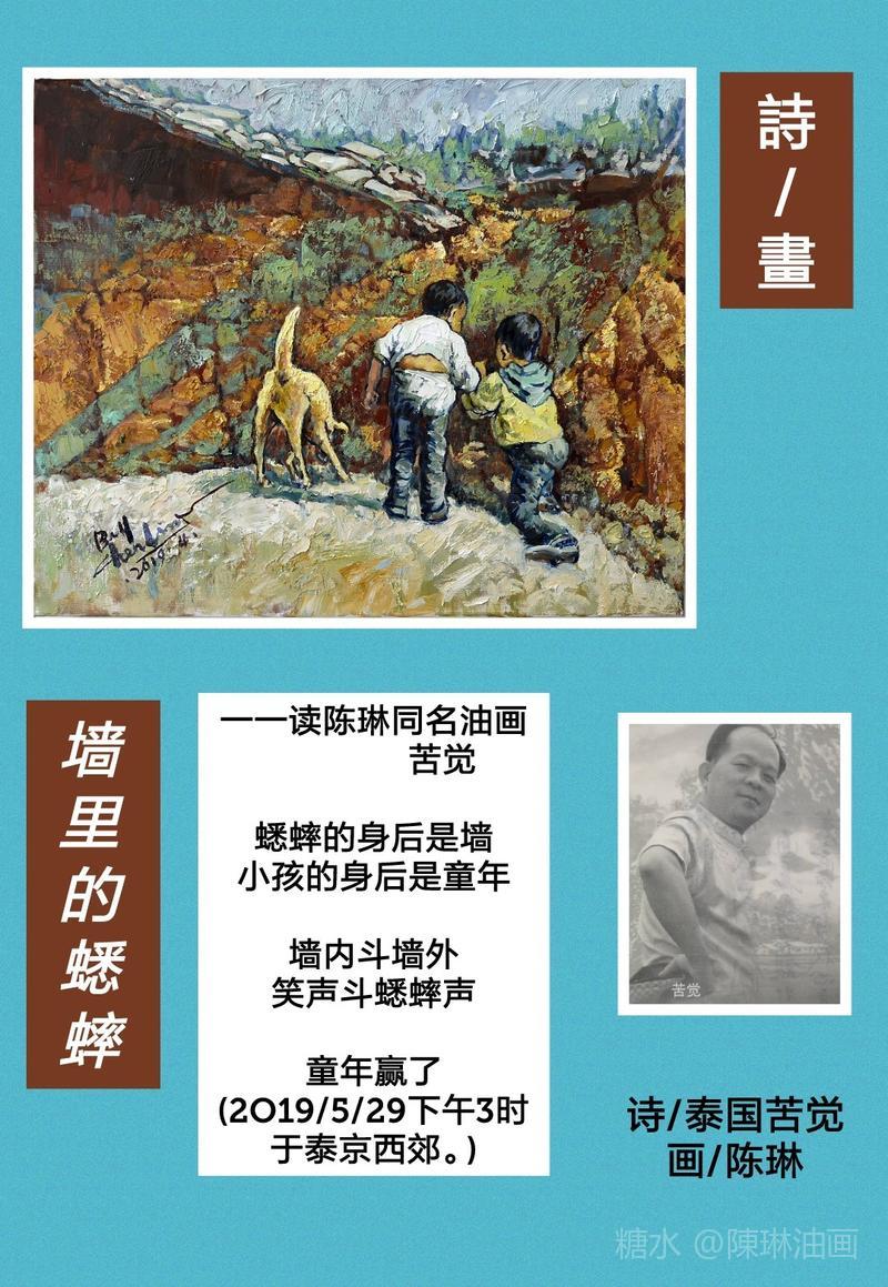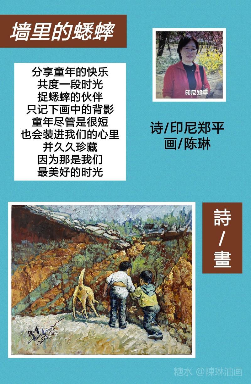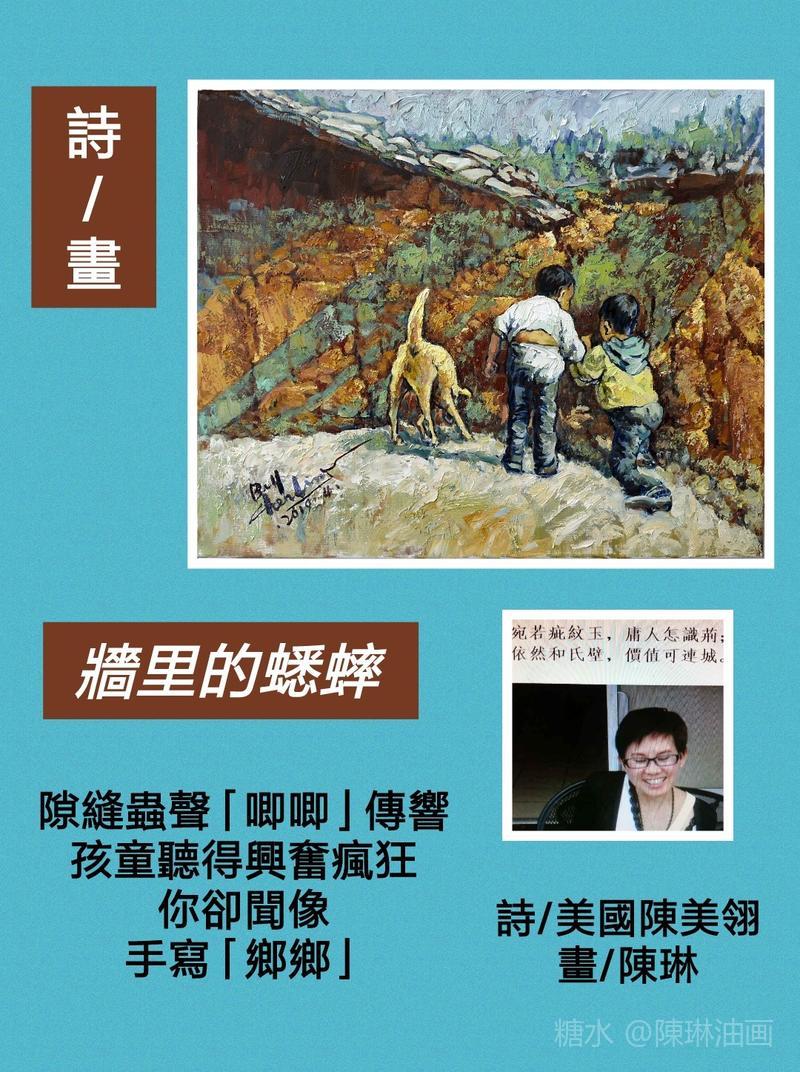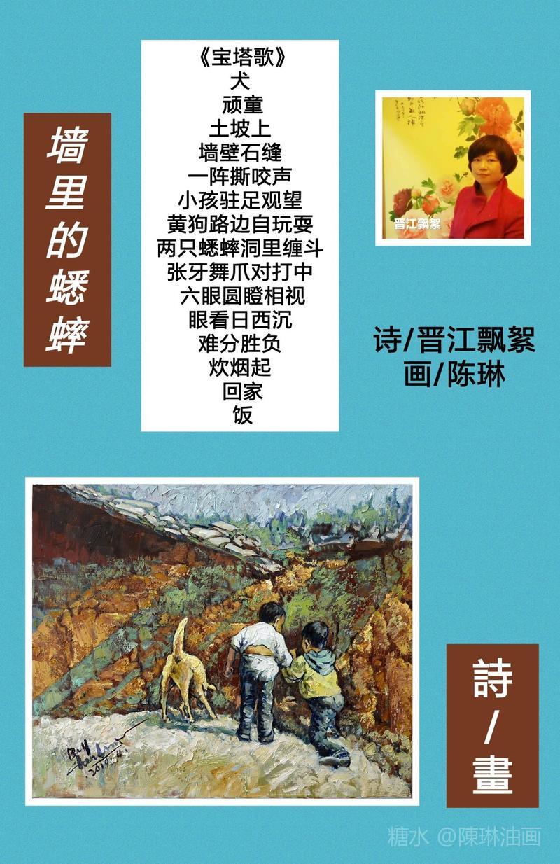 布面油画《墙里的蟋蟀》 作者:陳琳 规格:53*65cm 《墙里的蟋蟀》 作者:陈琳 忏悔的春风将太阳拉成细长 破落的斷垣传出亘古的亮嗓 是谁在歌唱? 一个凄美的故事在风中凌乱 碧空蒼茫,血色残陽 红土墙里有一个人间天堂 时光清浅,鲜花浪漫 西山日斜尽篇章 是谁把乡愁捧在手上 看在眼里有几多愁惆 抓住了远方星空浩瀚 我们就要出发追赶太阳 蟋蟀还在弹唱,琴声潺潺漫漫 野花谢过村庄,没有太多情伤 当画中月儿从树上熟落 你才会静谧于甜蜜梦乡
