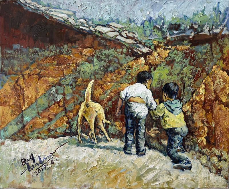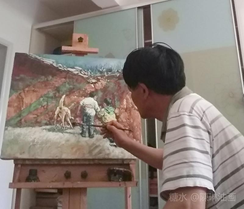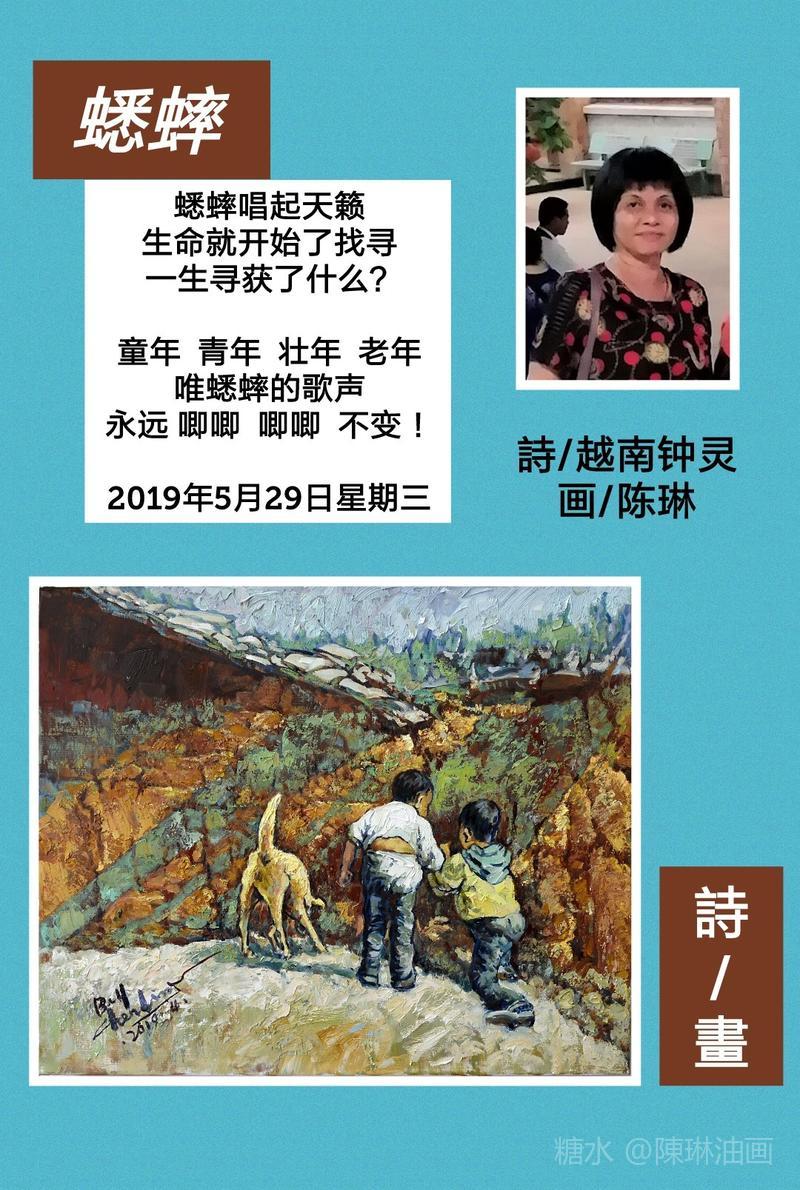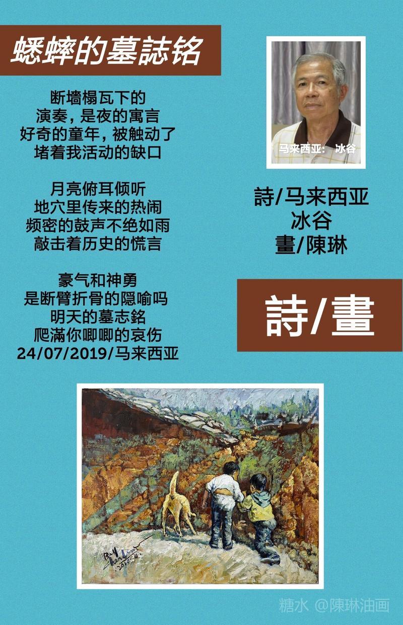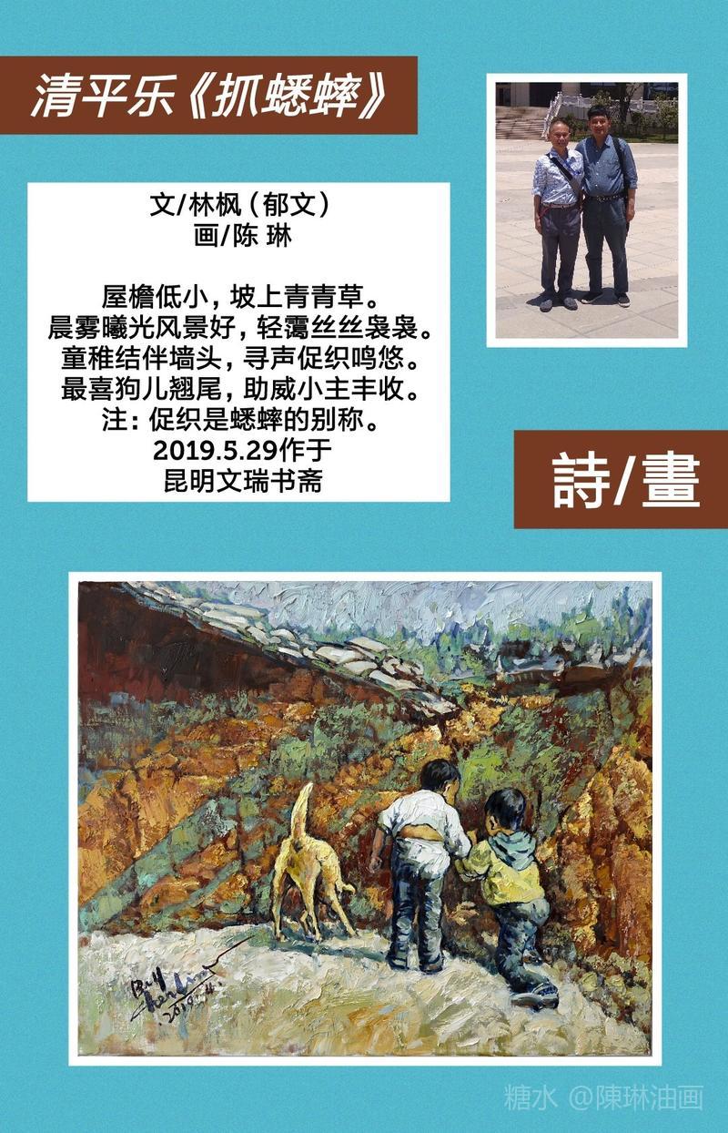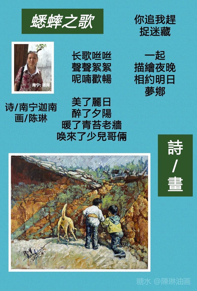 布面油画《墙里的蟋蟀》 作者:陳琳 规格:53*65cm 《墙里的蟋蟀》 作者:陈琳 忏悔的春风将太阳拉成细长 破落的斷垣传出亘古的亮嗓 是谁在歌唱? 一个凄美的故事在风中凌乱 碧空蒼茫,血色残陽 红土墙里有一个人间天堂 时光清浅,鲜花浪漫 西山日斜尽篇章 是谁把乡愁捧在手上 看在眼里有几多愁惆 抓住了远方星空浩瀚 我们就要出发追赶太阳 蟋蟀还在弹唱,琴声潺潺漫漫 野花谢过村庄,没有太多情伤 当画中月儿从树上熟落 你才会静谧于甜蜜梦乡