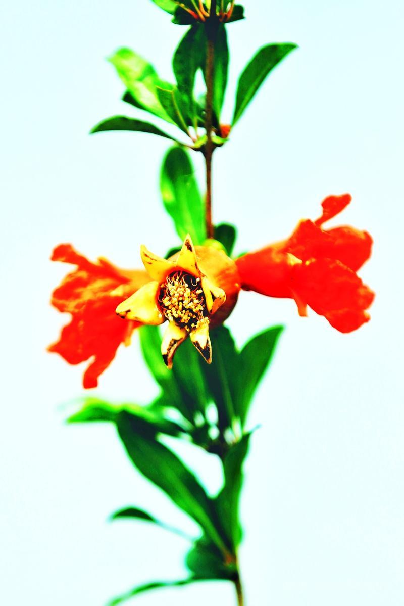 夏日,与朋友驾车从南村经古王村下山到东延村扫拍,路遇一农家门前的两棵石榴树花开了。远看,那红色的花朵像一簇簇火焰。近看,一朵朵石榴花像一个个小喇叭。淡黄色的花蕊在风中摇动,就像一群仙女在翩翩起舞。红的似火的石榴花,吸引着笔者下车拍照。