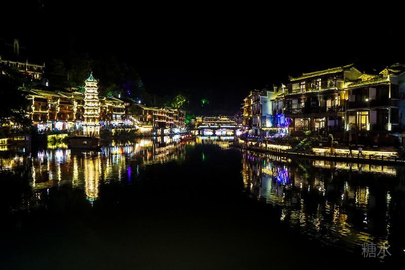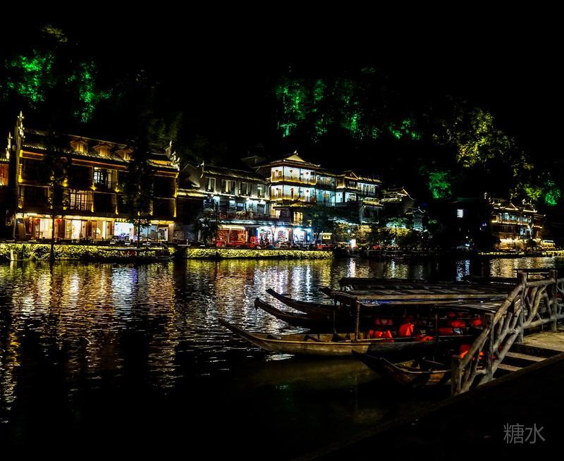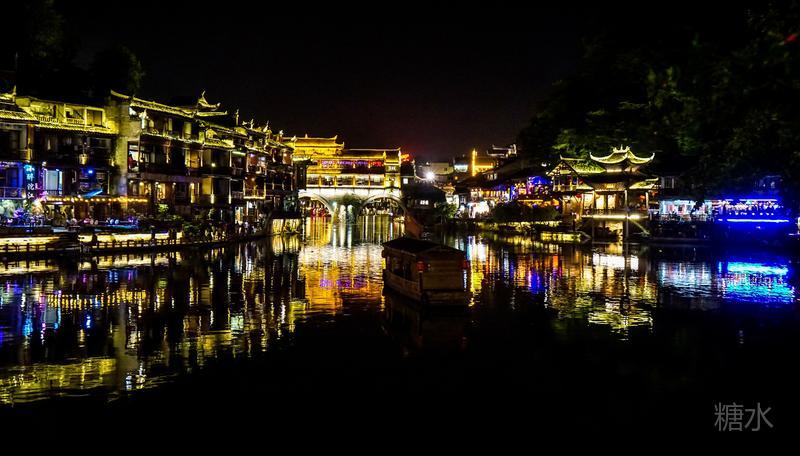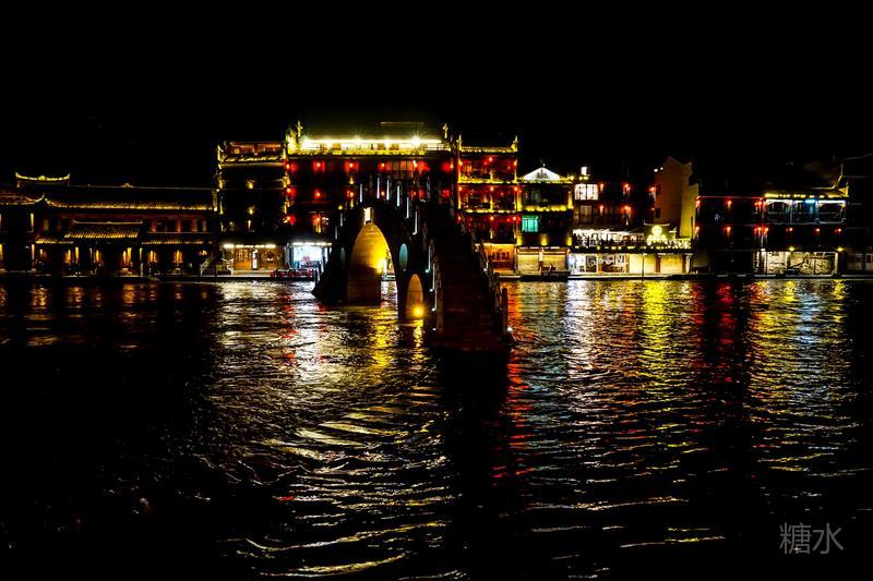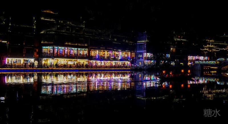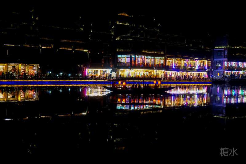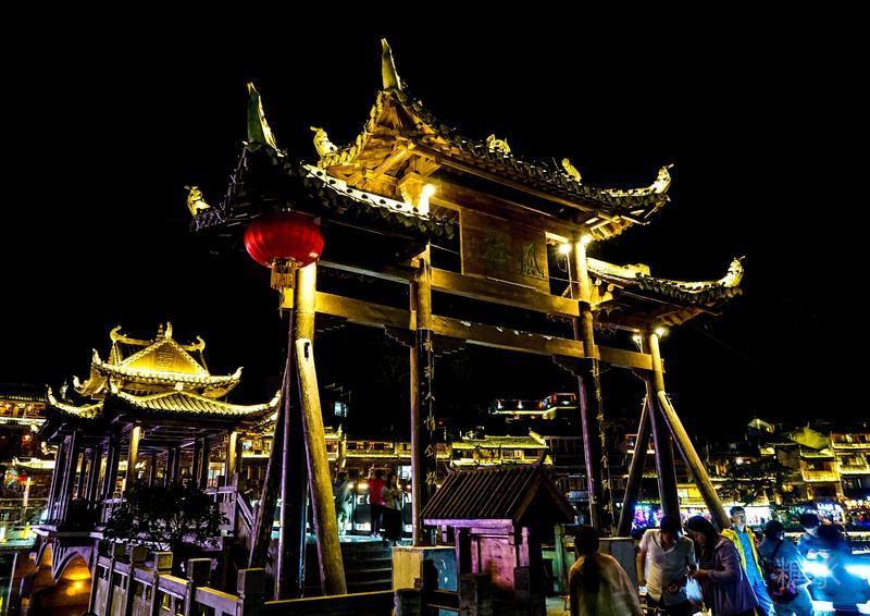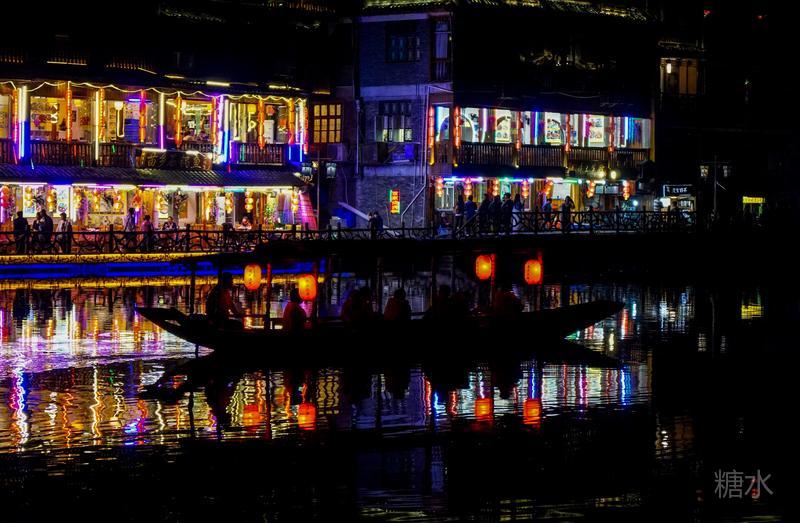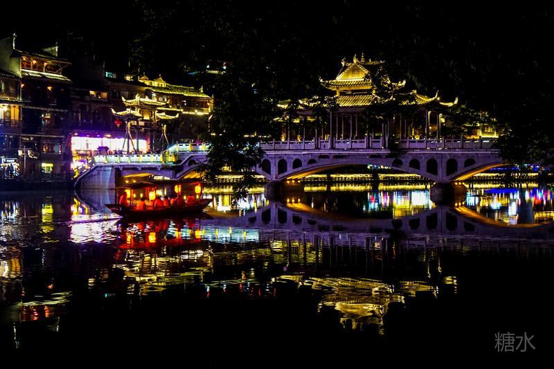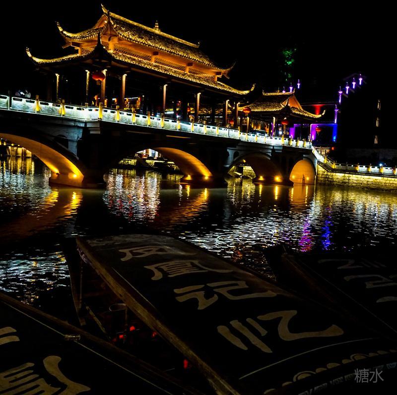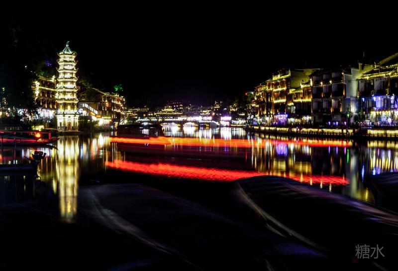 来凤凰不仅要欣赏沱江两岸若思迷幻的日景,更要欣赏沱江两岸璀璨迷人的夜景,否则,你不算来过凤凰。 用心品味凤凰古城,你会发觉这里“白天很古老,夜晚很现代”。说它夜晚很现代,是它10多年打造的旅游名牌,注入了现代元素,酒吧、美食街、特色蓬船、灯光工程等等,