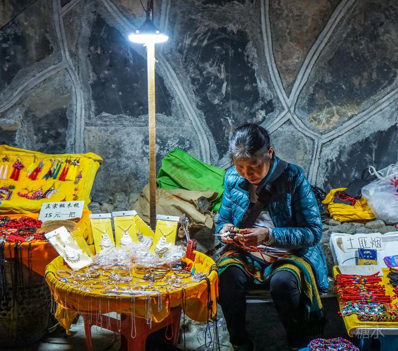 江边小摊位上,一大妈在作小工艺品。