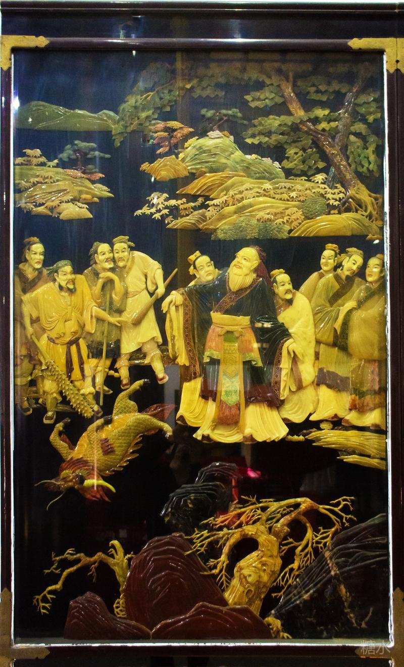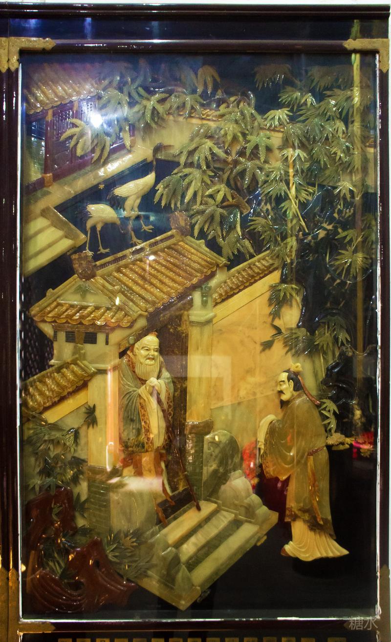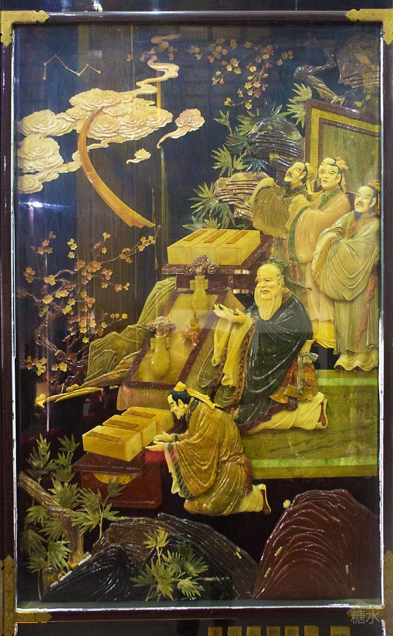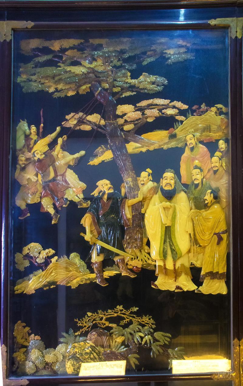 《孔子圣迹图》,是由浙江乐清200匠师采用取自浙江、福建、内蒙古、辽宁、青海、广西、广东等省(区)的内玉石、鸡血冻、寿山石、翡翠绿、周村冻等石中名晶及黄金、珠宝、罗钿等贵重的珠宝饰件,积三年之功雕成。 《孔子圣迹图》构图精练,造型完美,生动传神,不但反映了孔子的伟大思想,而且能使世人知晓至圣先师的善德懿行、人文内涵,也表达了人们对孔子的崇仰之意。