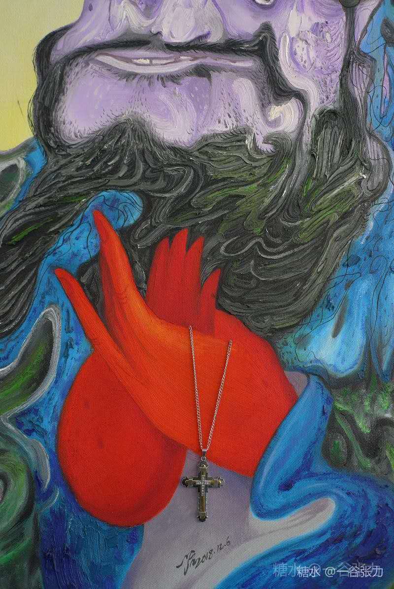 一谷张力创作《孔子像》,以一个现代齐鲁人的文化认知,借孔子图形去追问和评判当下,以隐喻的手法承载精神变异的图式。他借达利之手为圣人也为世人描写一幅幽兰灰白大红及现成品十字架的“孔子“相。耶稣在孔子手上把玩掂量,艺术家的荒诞手法正是中西文化的际遇,也给观众留下疑问一一一矫情的兰花指挂着的十字架是否暗喻中西文化的冲突?抑或信仰缺失的焦虑?人们站在《孔子像》前思量:“道‘是否淤塞?“仁“是否败落?“礼'在何处……?红色之手中似乎理想尚存又似乎难觅知音。一谷张力幻化扭曲的这许多符号,是否正是我们他们和眼前这个世界的“真相“?