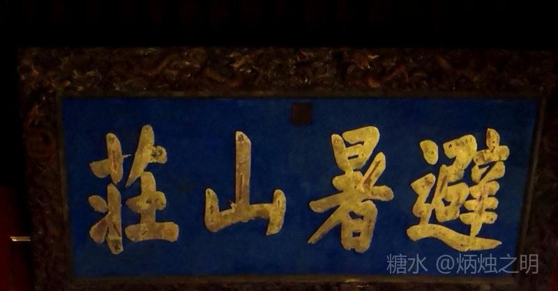 避暑山庄正殿大门的上方悬有一块匾,上面写着“避暑山庄”四个镏金大字,为康熙皇帝的御笔,字体浑厚、有力,虽历经几百年仍熠熠生辉;