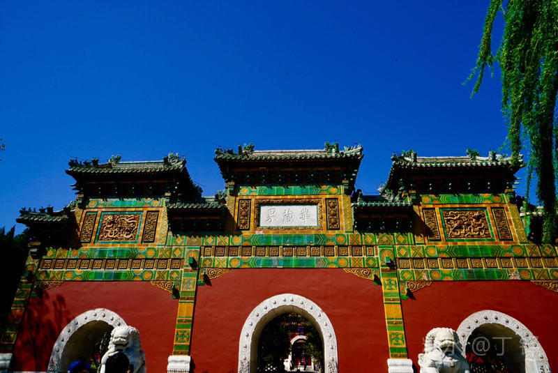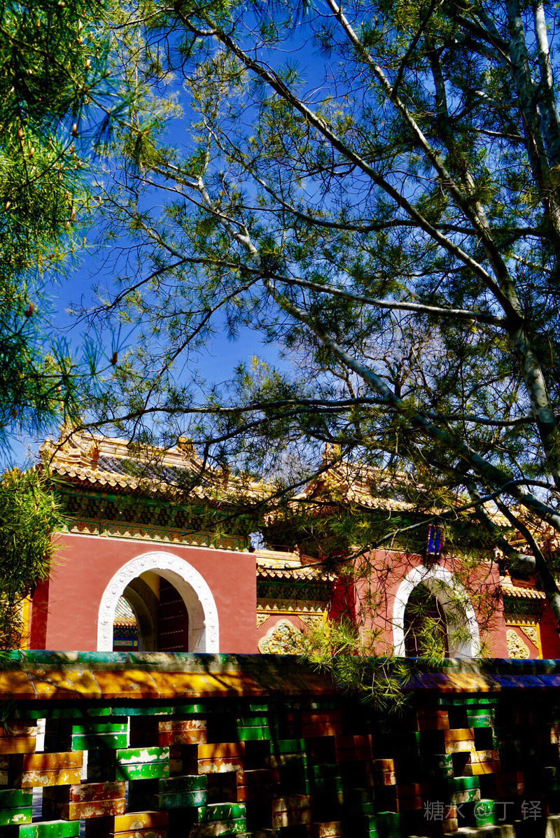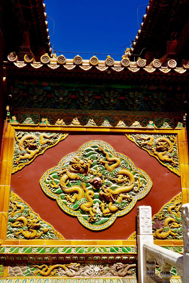 影壁用424块预制的七色琉璃砖砌筑而成,色彩绚丽,古朴大方,是清代 琉璃结构建筑中的杰作。