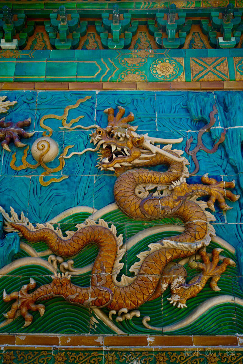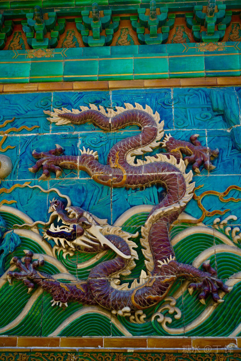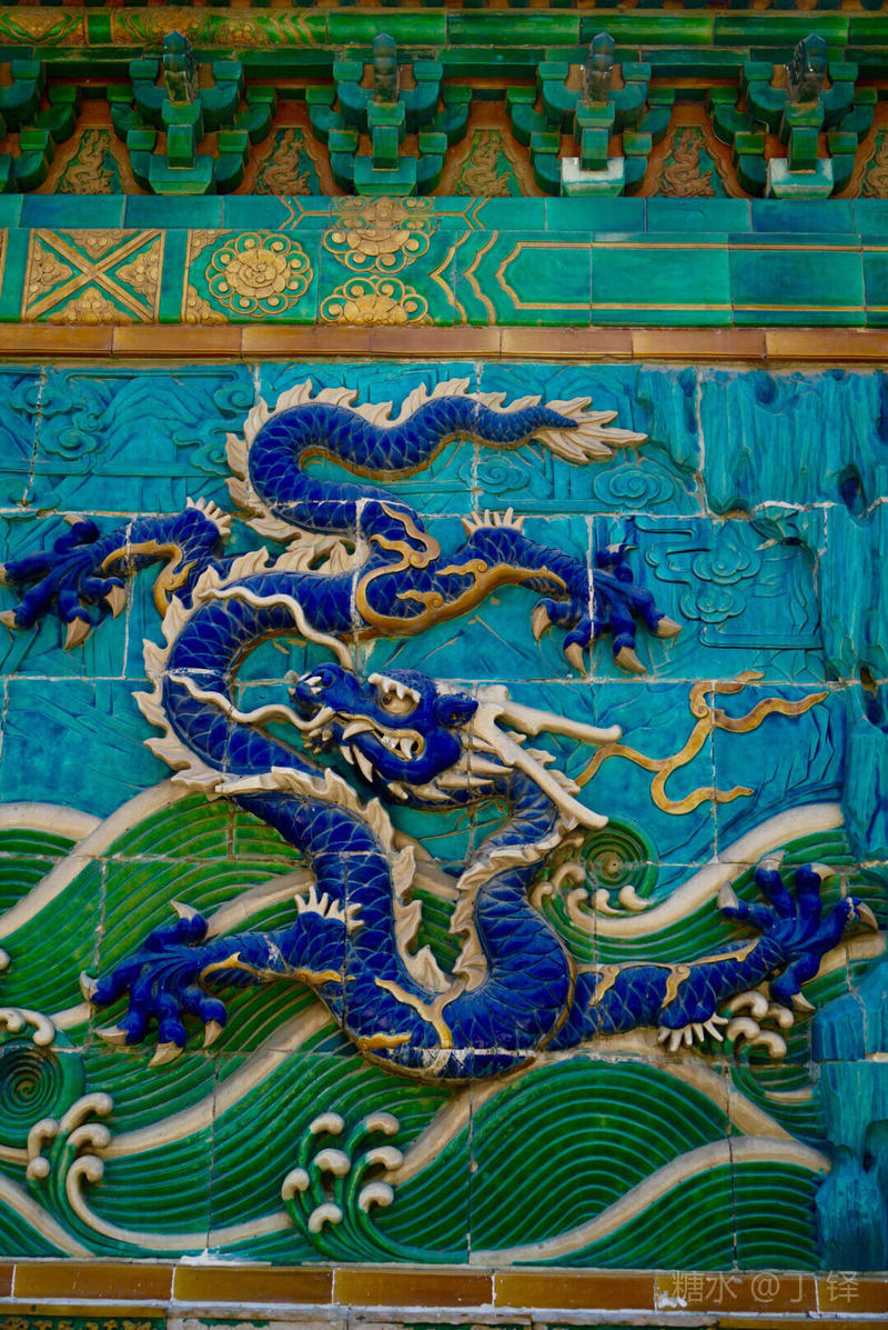 “北海九龙壁除了壁前壁后各有9条醒目的戏珠 蟠龙外,壁的正脊、垂脊和其他一些建筑构件等地方都有 龙的踪迹。九龙壁顶呈“庑殿式”,有一条正脊,四条垂脊,正脊前后各有9条龙,垂脊左右各有一条龙,正脊两侧有两只吞脊兽,它的身上前后也各有一条龙,这样五条脊上就有30条龙。