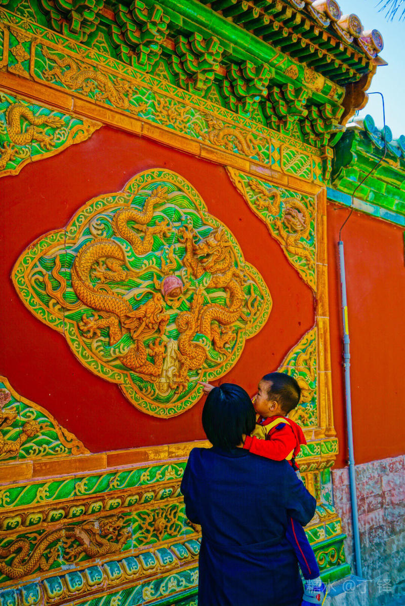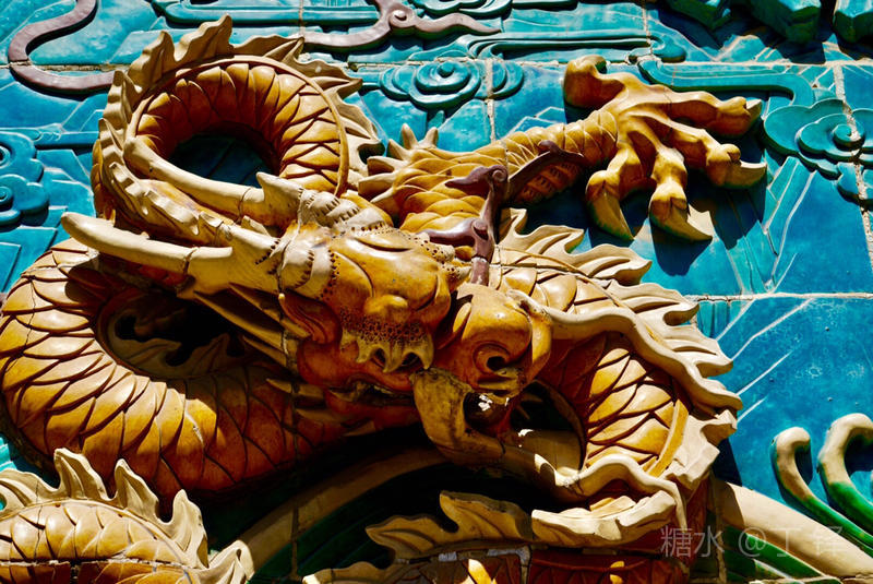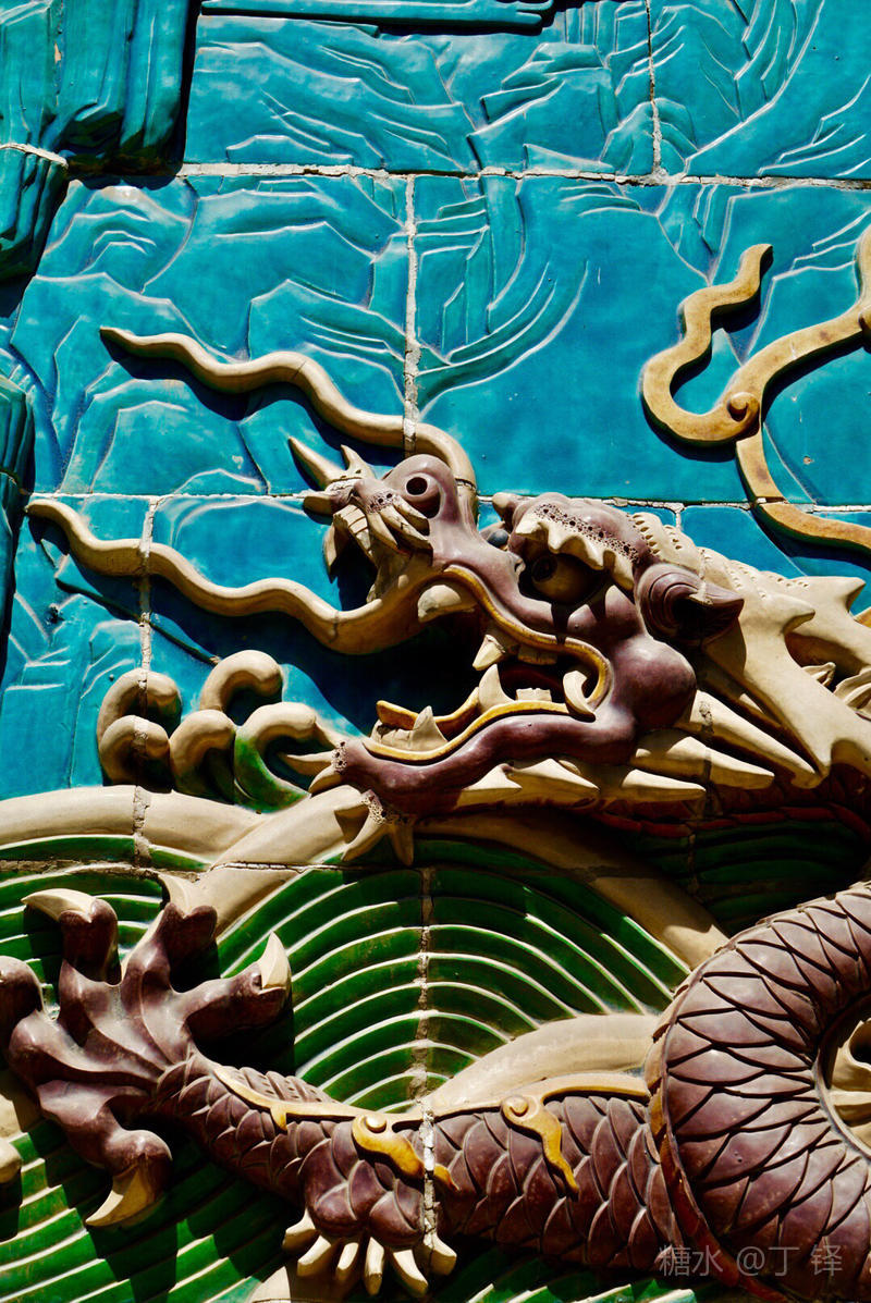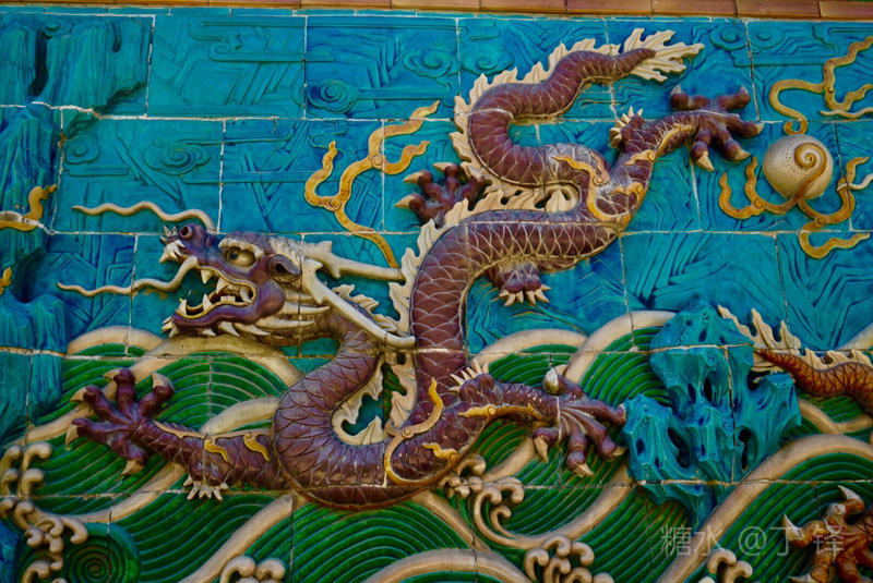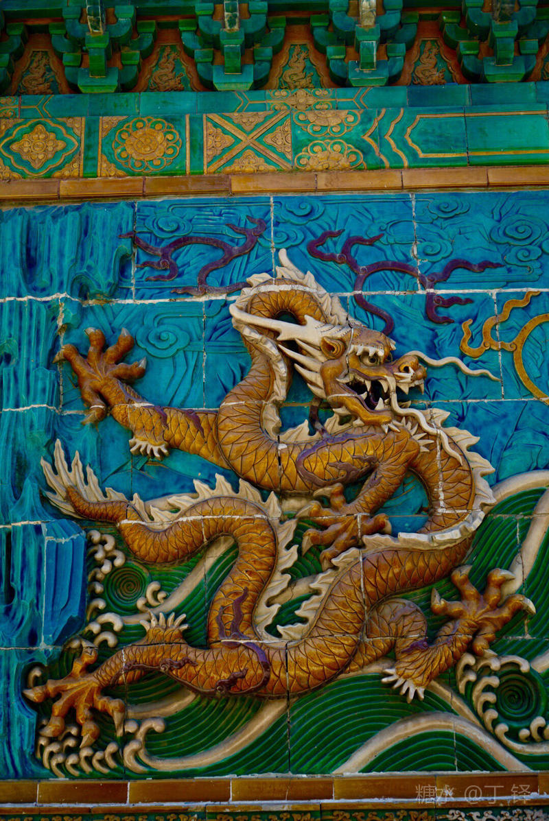 “北海九龙壁除了壁前壁后各有9条醒目的戏珠 蟠龙外,壁的正脊、垂脊和其他一些建筑构件等地方都有 龙的踪迹。九龙壁顶呈“庑殿式”,有一条正脊,四条垂脊,正脊前后各有9条龙,垂脊左右各有一条龙,正脊两侧有两只吞脊兽,它的身上前后也各有一条龙,这样五条脊上就有30条龙。