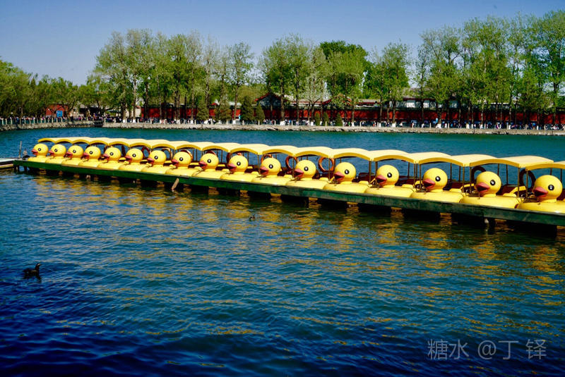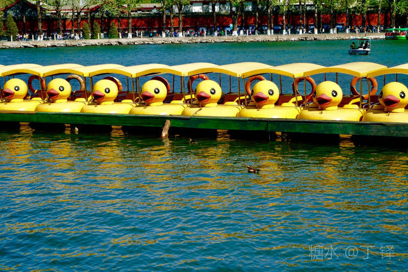 排列的鸭舟,等待游客的到来,小黄鸭在北海也算一景,会勾起不少老人少儿的回忆。