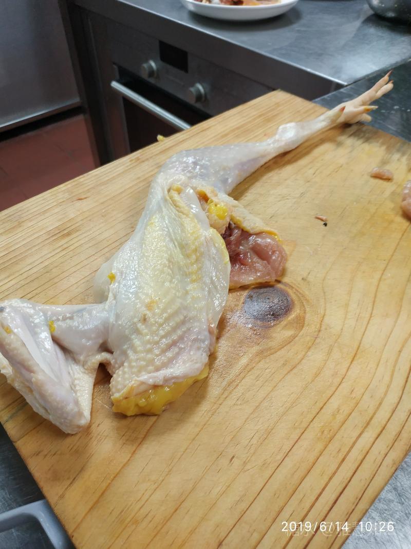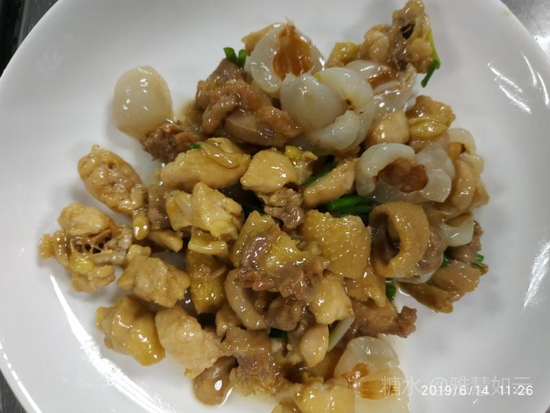 98.荔枝炒鸡球 主料:线鸡一只 辅料:新鲜荔枝1斤,剥皮取果肉; 料头:蒜片,姜指甲片,香葱段; 配料:五味,酒,糖,生粉; 刀工: 全鸡剔鸡肉和切鸡肉(球)方法: 1.鸡剔骨架,从鸡翅膀入刀,切断骨关节,顺势拉出半个鸡的肉,刀到鸡腿时,用左手大拇指顶出腿骨关节,即可脱骨臼,此时拉出半只鸡的 肉,包扩半个鸡翅膀连体鸡腿部位。 2.剔除鸡腿主骨和针骨,腿肉中间的针骨如同牙签长。同步剔出鸡翅膀大骨头。 3.将鸡肉切小块(球),稍厚的鸡肉部分,用刀稍轻剁切记不断皮哦,使其易熟入味。 做法: 1.腌制鸡肉,放五味+酒,小苏打,生粉伴匀待用。 2.油锅油温200°过鸡肉,炸至刚熟即捞起备用。若在家可以油炒。 3.另起锅放油,蒜片,姜片,葱白爆香,放入耗油,鸡球,蘸酒,糖,盐翻炒入味,再放入荔枝果肉瓣,葱段快速翻炒起锅,盛盘即可。