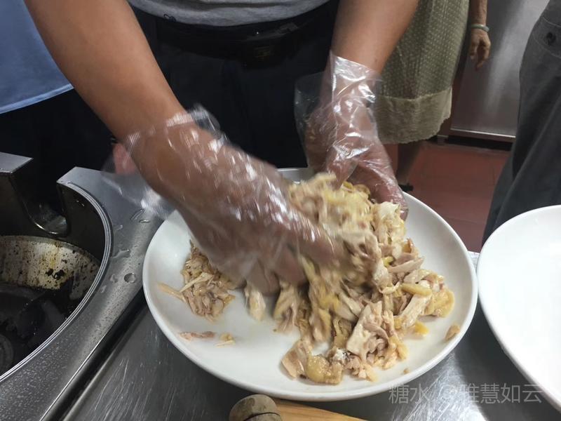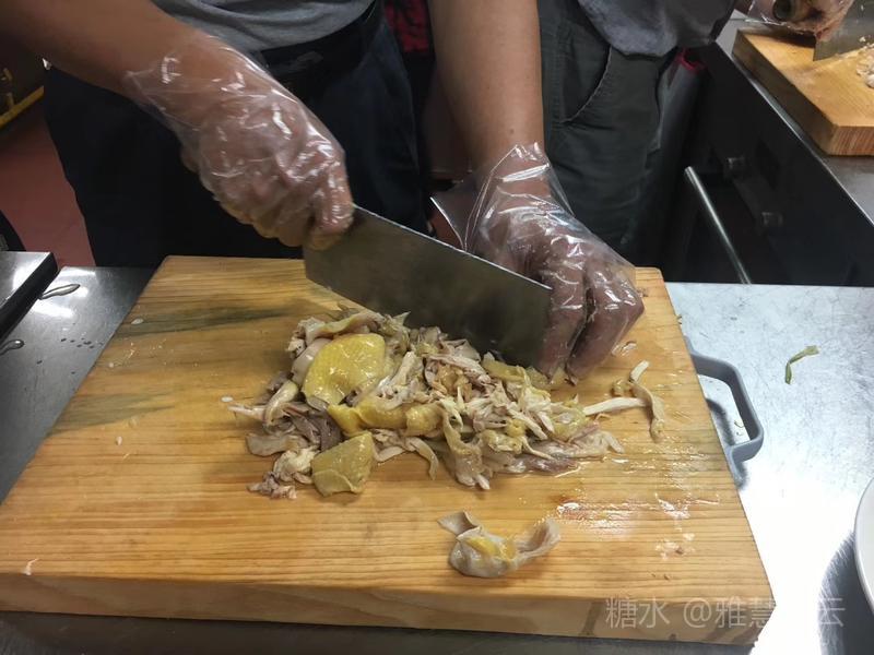 94.手撕鸡 主料:全鸡一只 辅料:花生,芝麻 料头:香葱,姜丝,香菜 配料: 做法: 1.煮白切鸡,做法参照已有教材,附上图二维码链接; 2.调拌料 1)花生芝麻分别炒香,花生去皮碾碎,芝麻碾碎待用。 2)容器中放入姜丝,葱白段,盐焗鸡粉,耗油,花生油,香油,伴匀,再放香菜段,花生,芝麻碎。 3.手撕鸡肉丝处理,具体做法详见视频。 4.拌鸡肉.将鸡肉丝放入拌料中,双手带卫生食品手套,充分伴匀,盛盘即可。 温馨提示: 过年的大线鸡,选择做手撕鸡,一鸡两吃,骨架炖汤,爽口不腻。