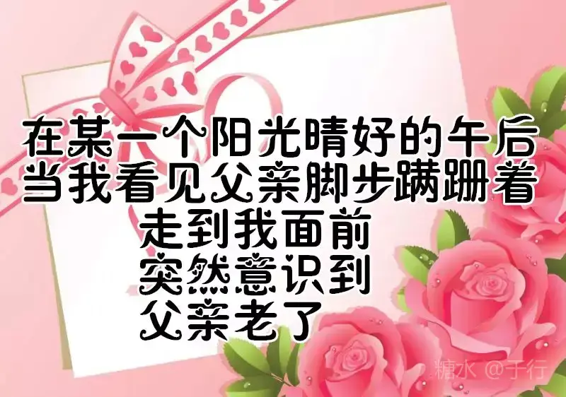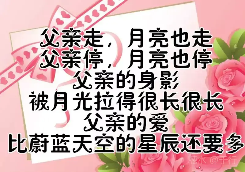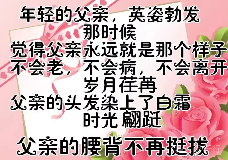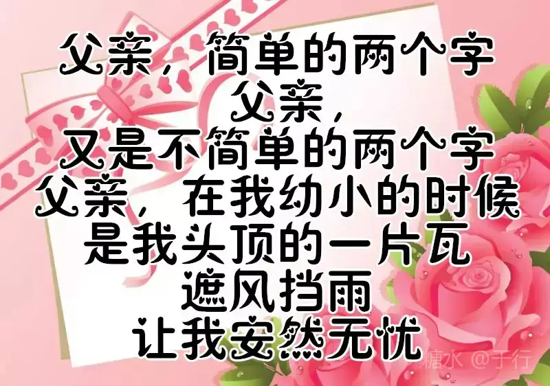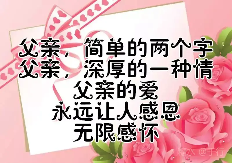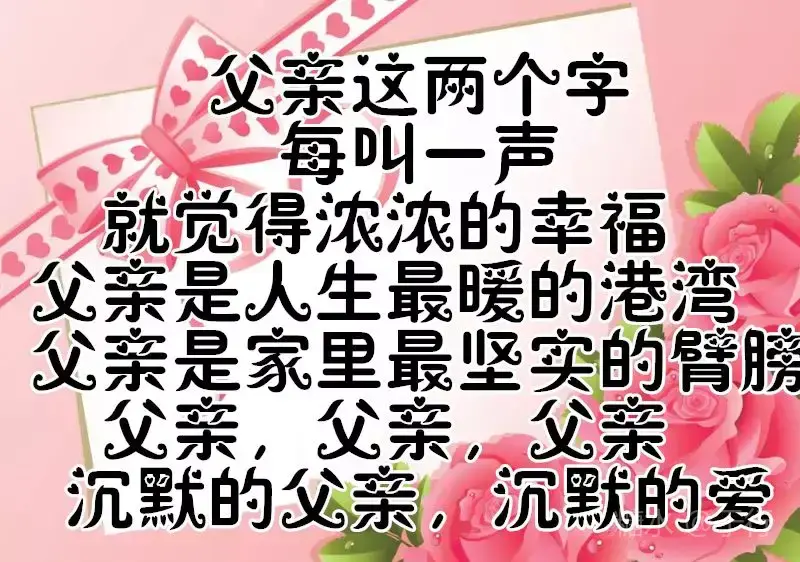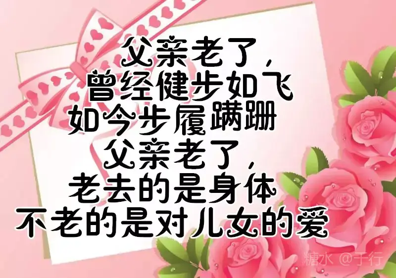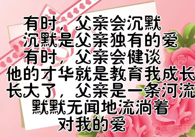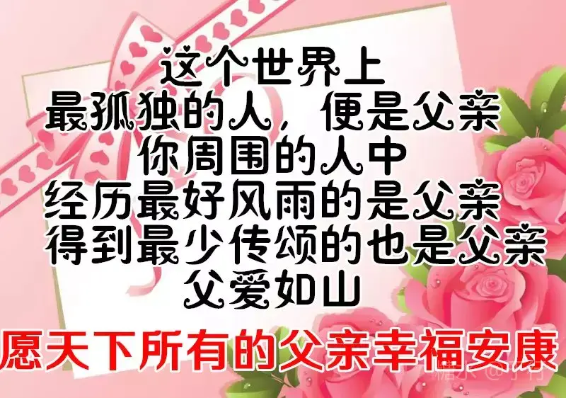 有一种爱不言不语,却不离不散 那是父爱无边 有一种爱不声不响,却不移不变 那是亲情永远 有一个人不偏不袒,却不能不见 那是父亲的脸 父亲节到了,愿天下所有的父亲 👨👩👧健康长寿,幸福永远。