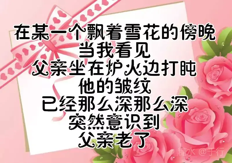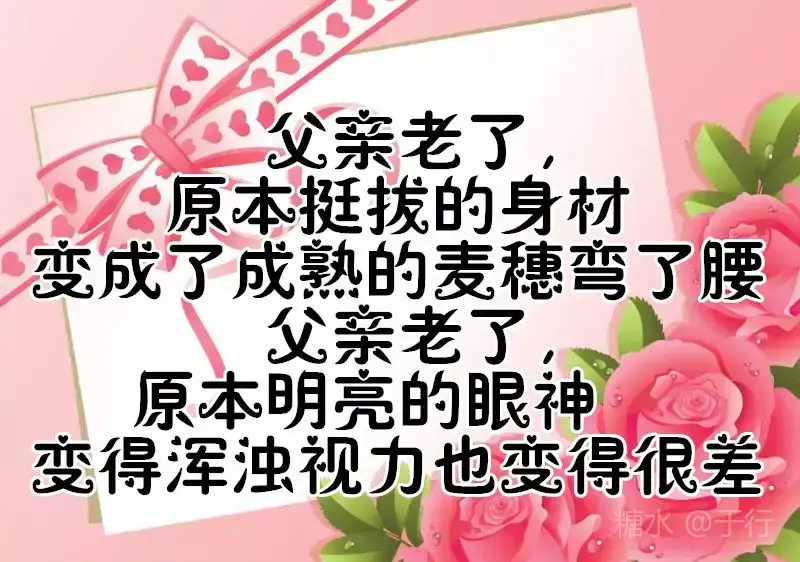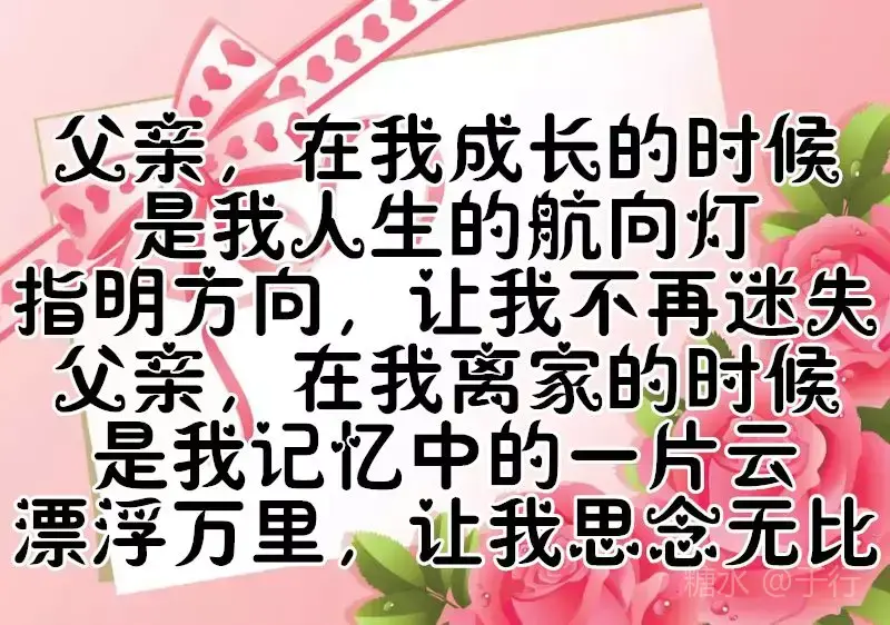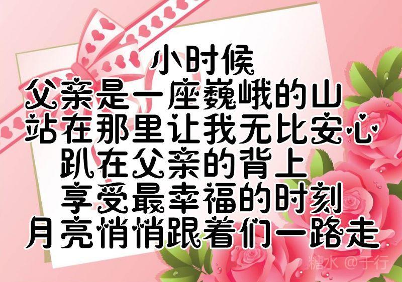 成家的,没有成家的,都会有个家 当爸的,没有当爸的,都会有个爸 父亲节到了 有事的,没有事的,都要打个电话 回家的,没有回的,都要记得问候他 父亲节 祝天下父母健康、平安快乐幸福