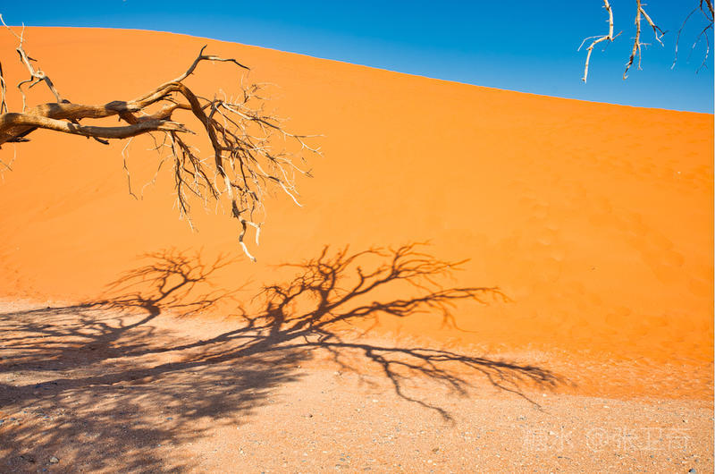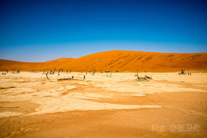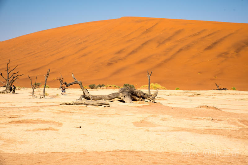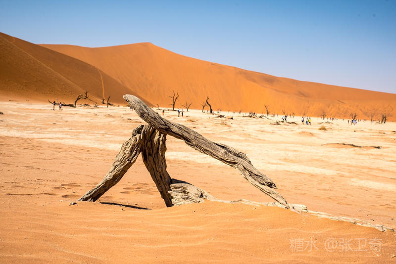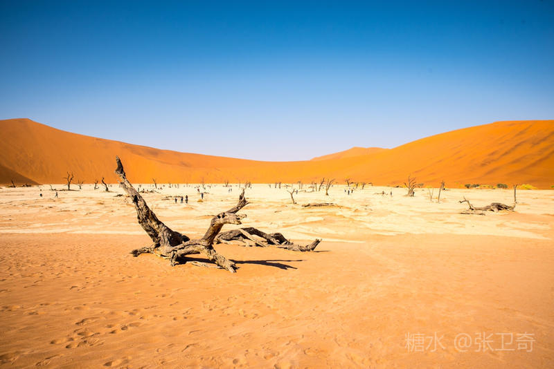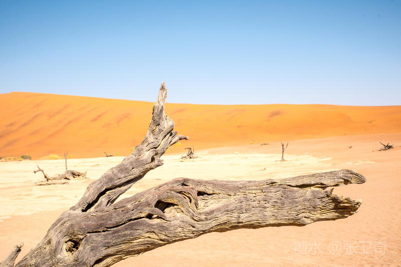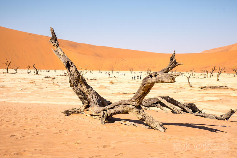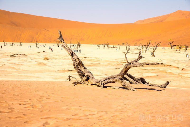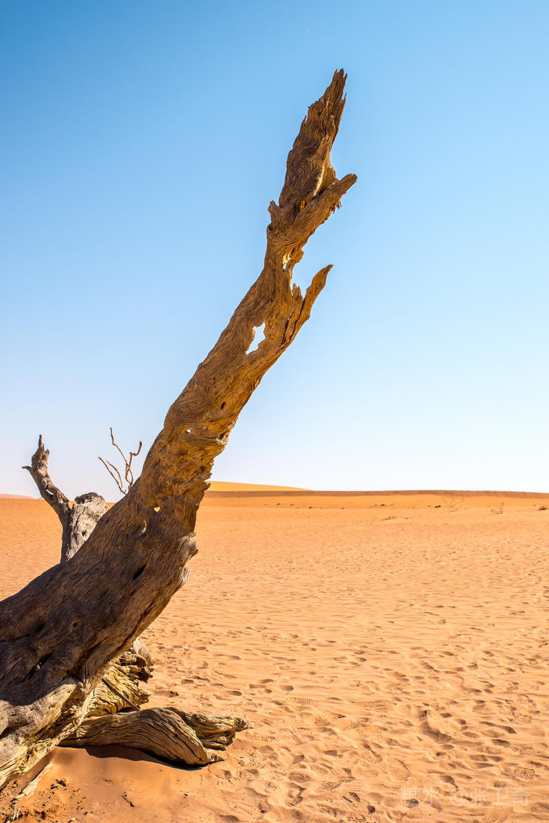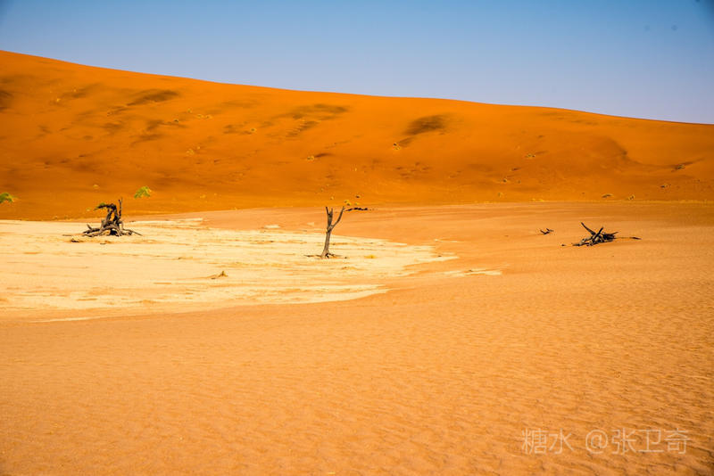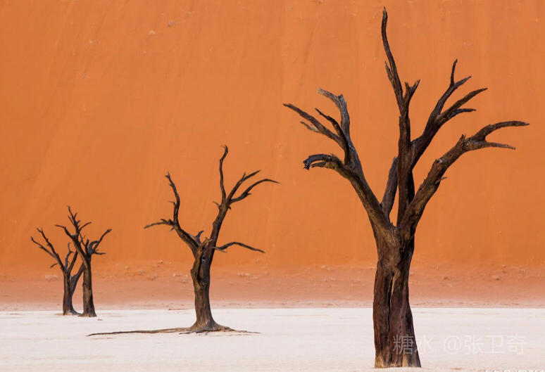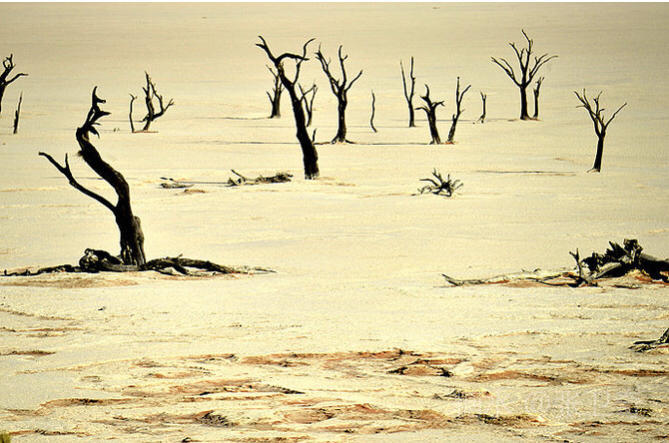在这个被铁红沙丘包围的干枯的白色盐碱地里,树木早就枯死,却依然挺立,似乎已经成为一座座融成化石的纪念碑,让人们感受到生命的坚强,岁月的无情变迁,领略沧海桑田,死亡的苍凉。