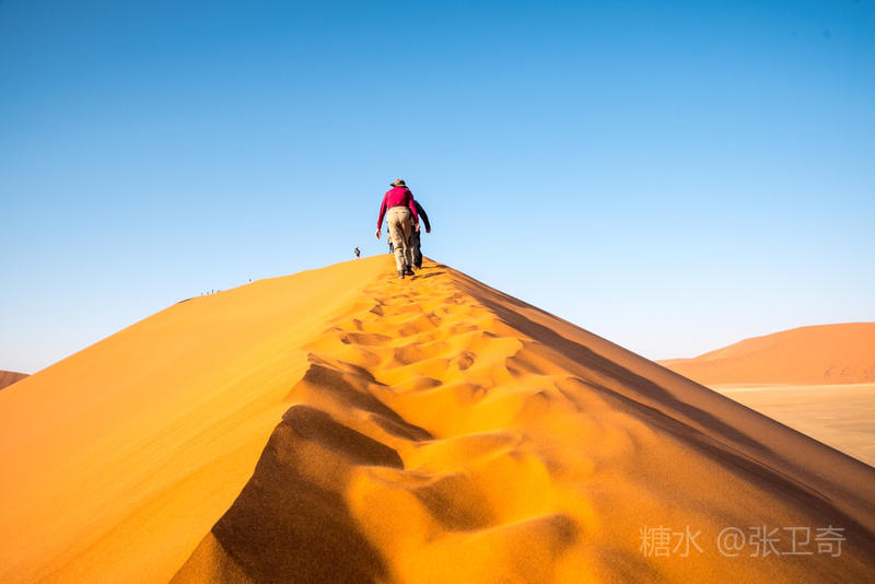 不过要爬上这座沙丘比登山要难多了,脚踩到沙丘上,软绵绵的沙子就将你陷下去,而且沙子还要往下滑,你似乎又被送到原处。与其说是往上爬行,还不如说往上爬三步,又往下滑两步,但为了那顶端上的景色,绝对值得一试。