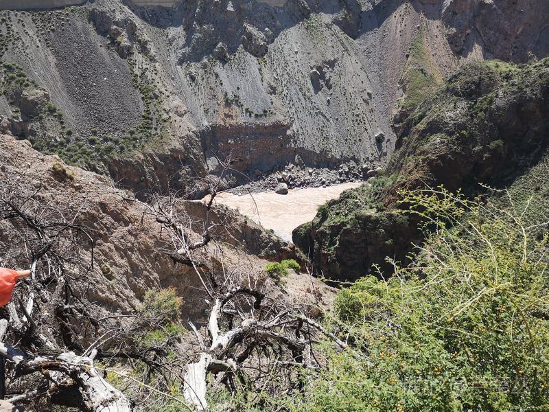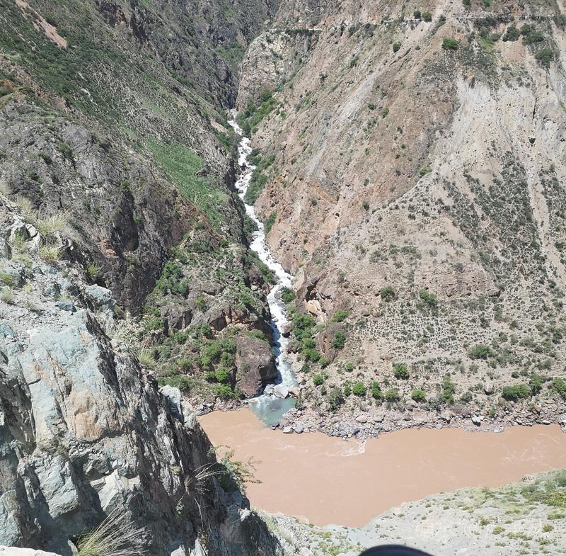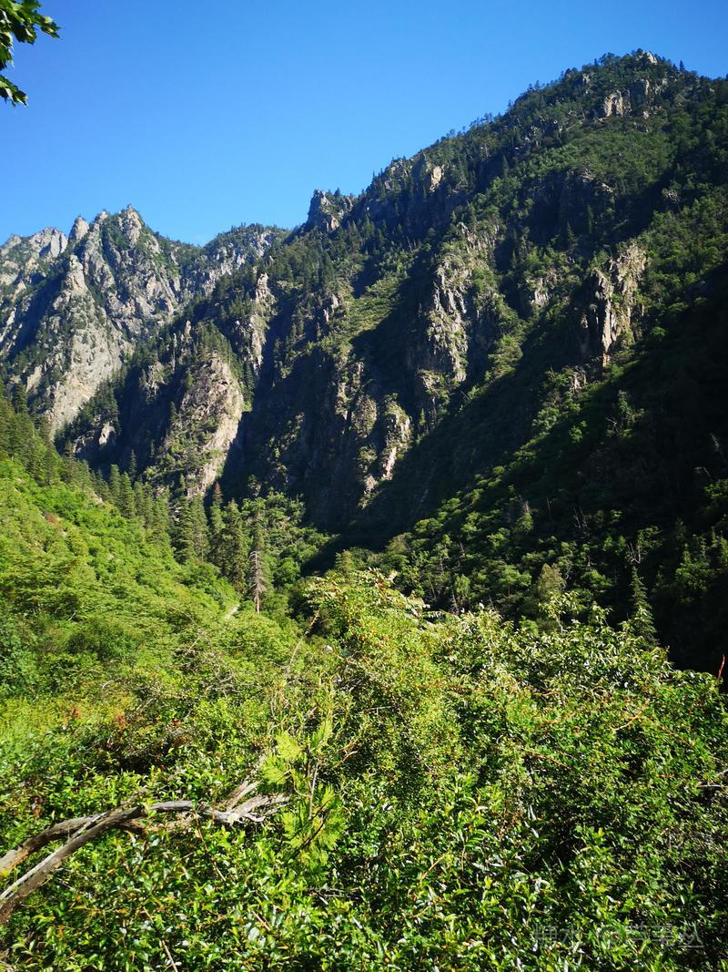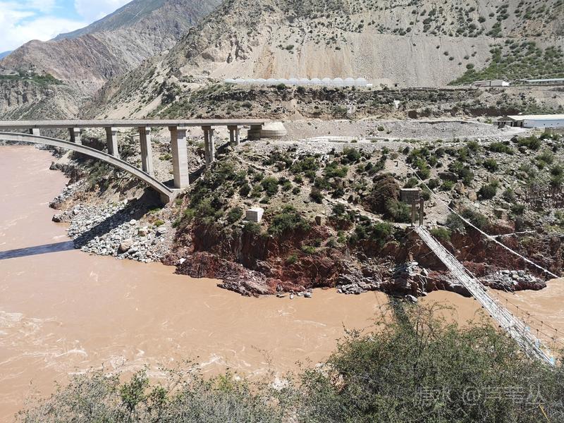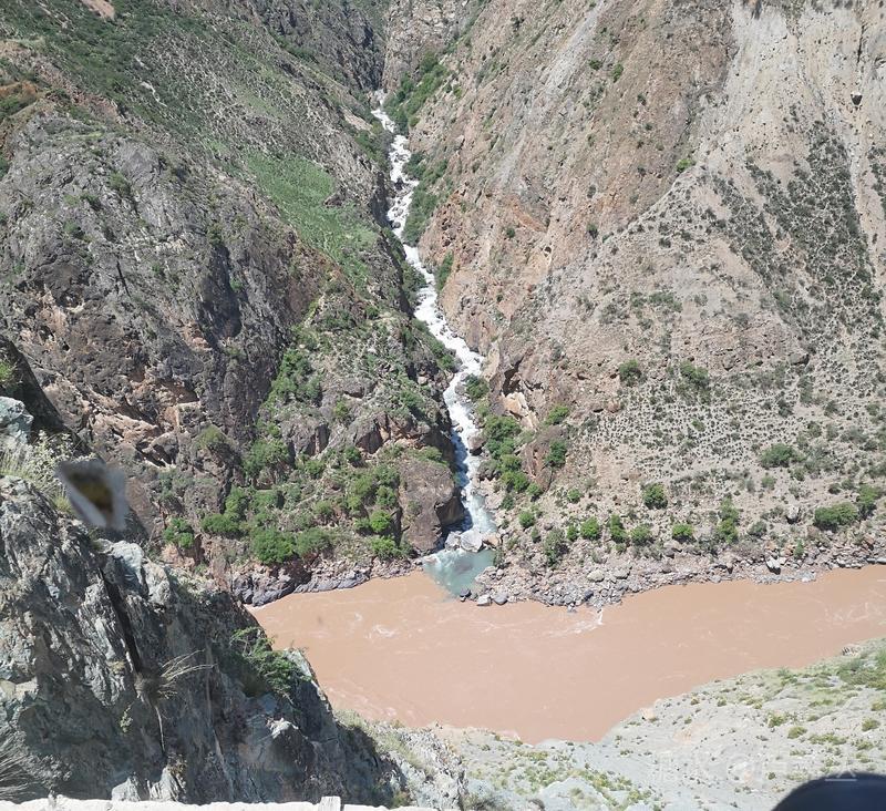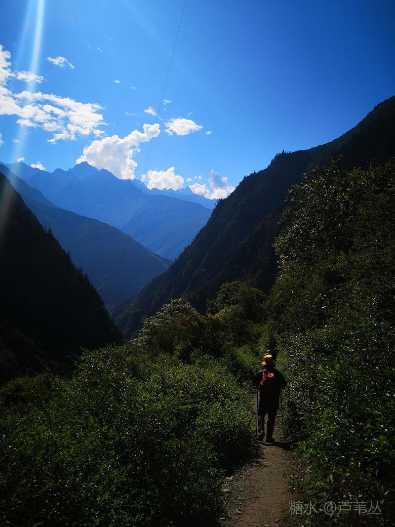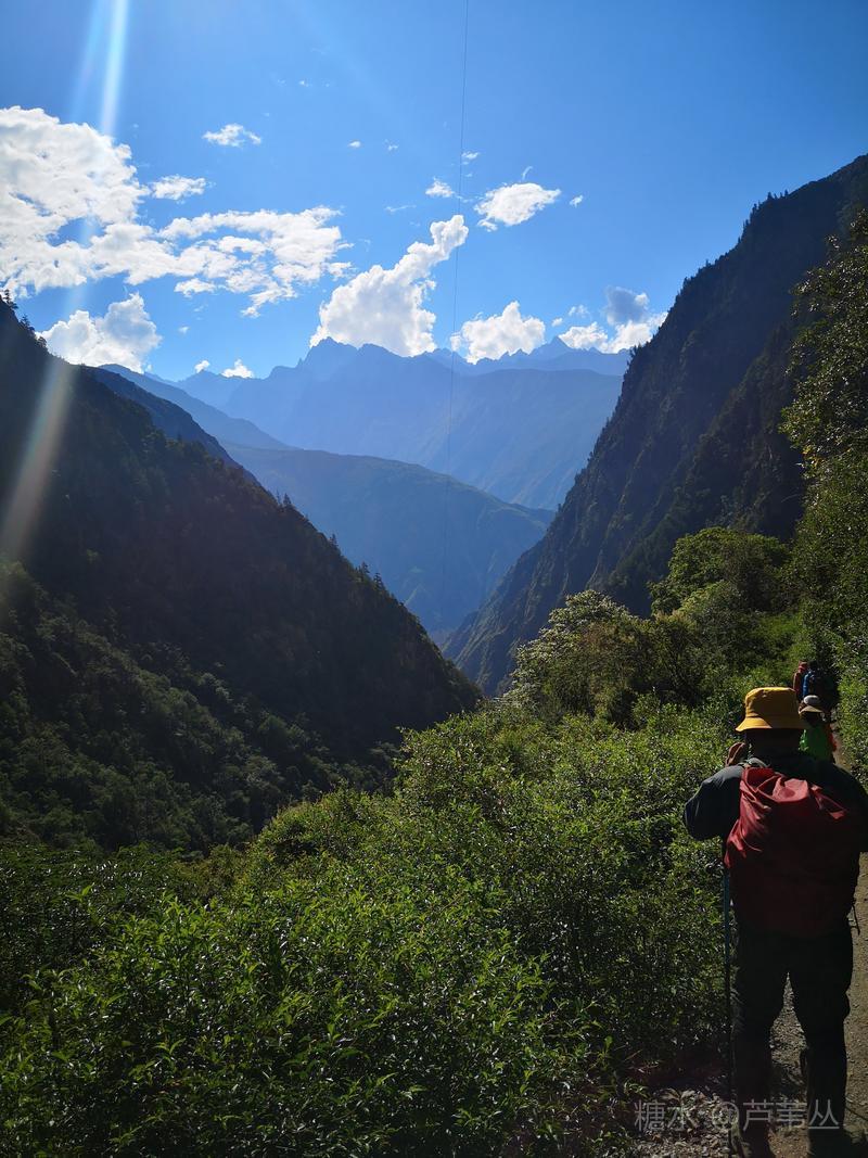 在山的对面远眺尼龙大峡谷河水与澜沧江汇合,此地比出发地雨崩上村的海拔位置已下降1000多米,尼农大峡谷山路艰险车马也无法代步。