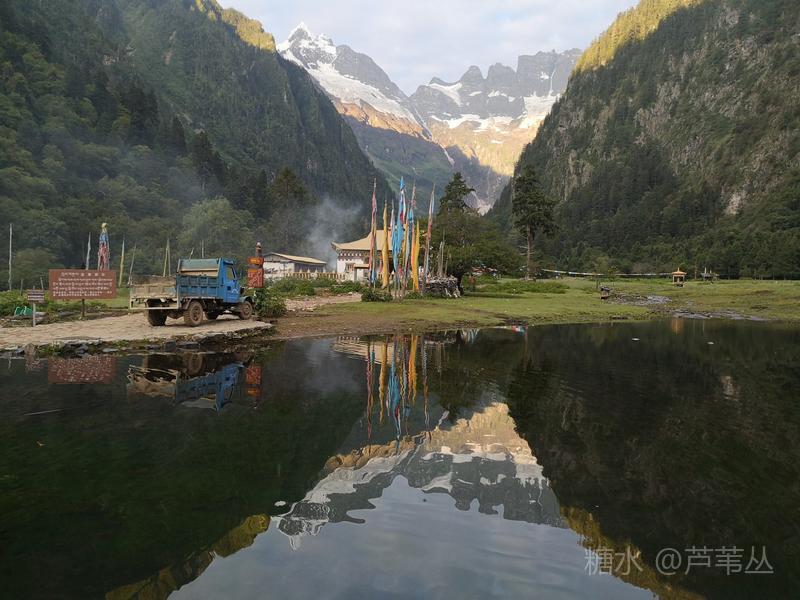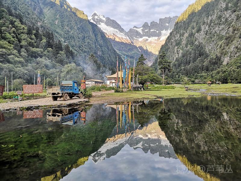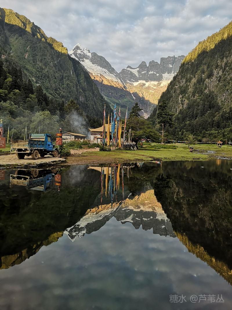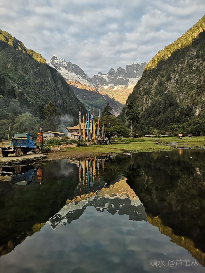 雨崩下村后一汪小池将雪山影映,水天一色美景如画。