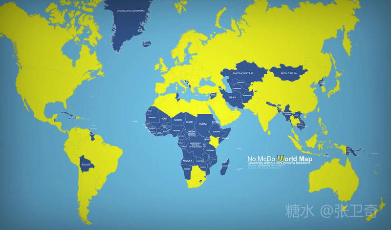 在网上查了以后才发现,这个世界上确实还有一些“没有麦当劳”的净土(蓝色),其中大部分在非洲!