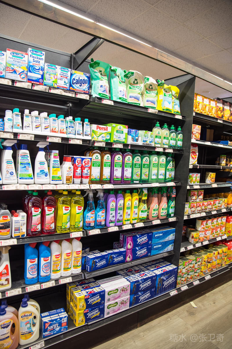 这里购买洗衣液、洗洁剂,后面是不同的罐头食品