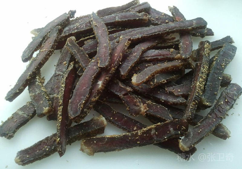 我们很好奇,买了一包,味道还可以,有点像中国的”牛肉干“和“猪肉干”。