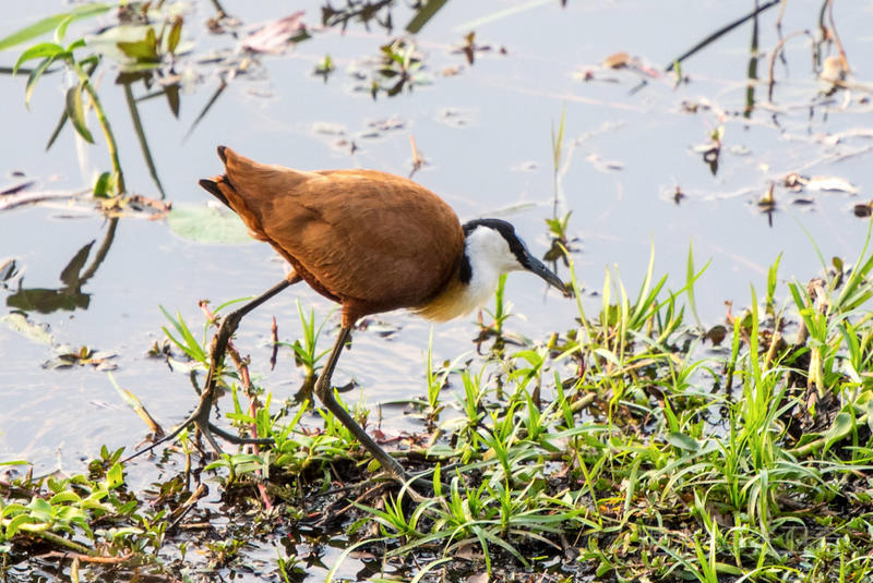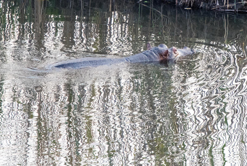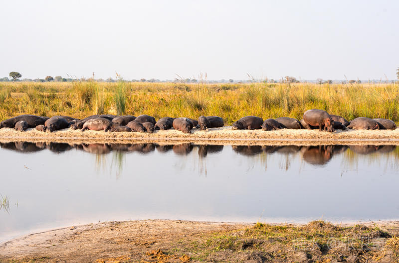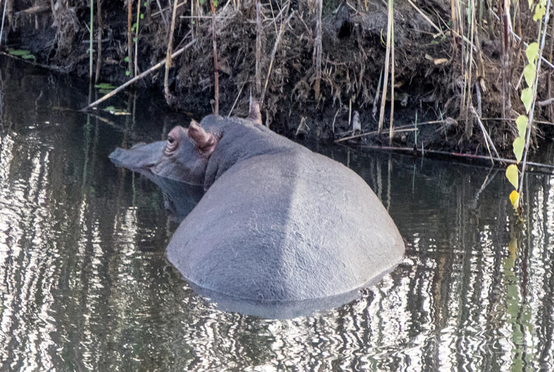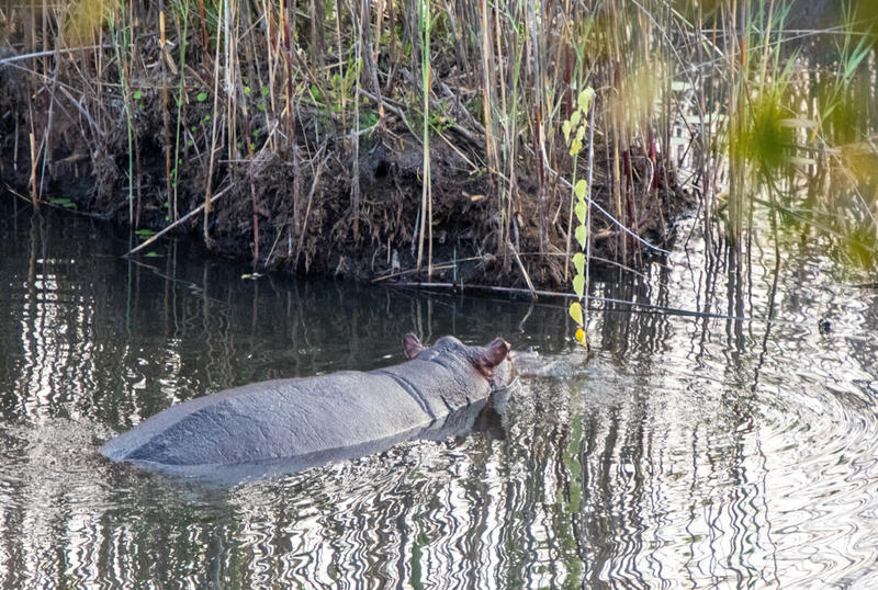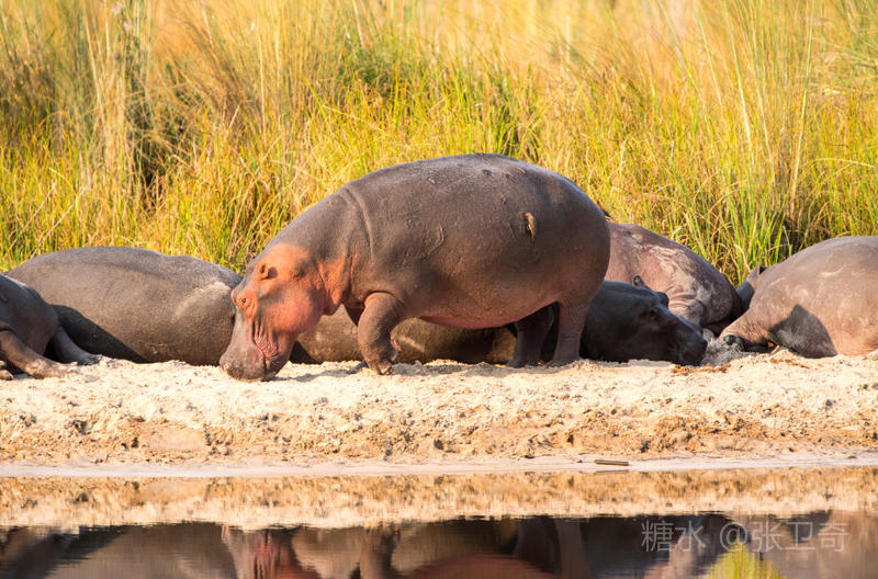 旅店前就是一片芦苇、绿洲和河流。早上天刚亮,你就会被不同的鸟鸣,以及各种动物的鸣叫声吵醒,其中比较特殊的是河马的低频洪亮的鸣叫声。走出去一看,很快就发现一对海马,它们正在进早餐呢!