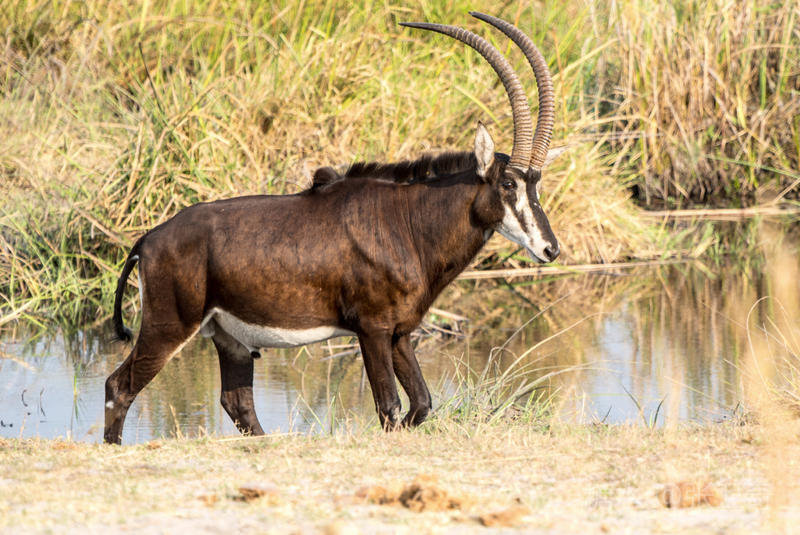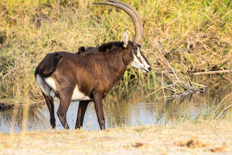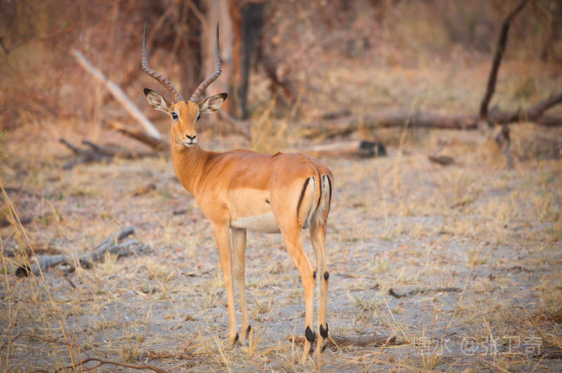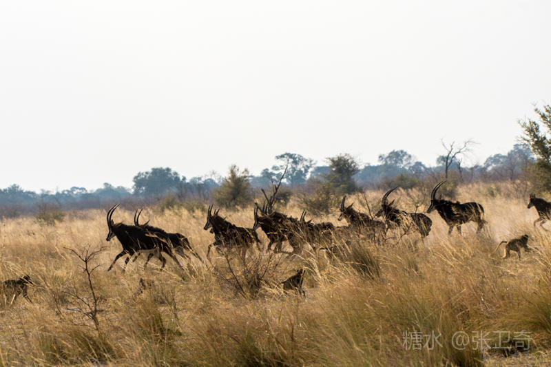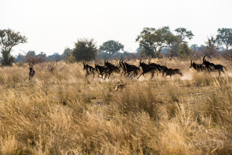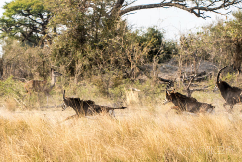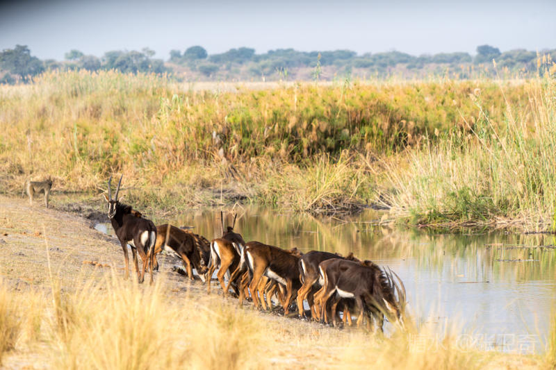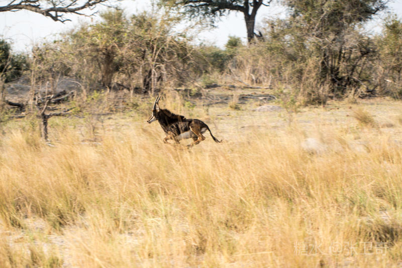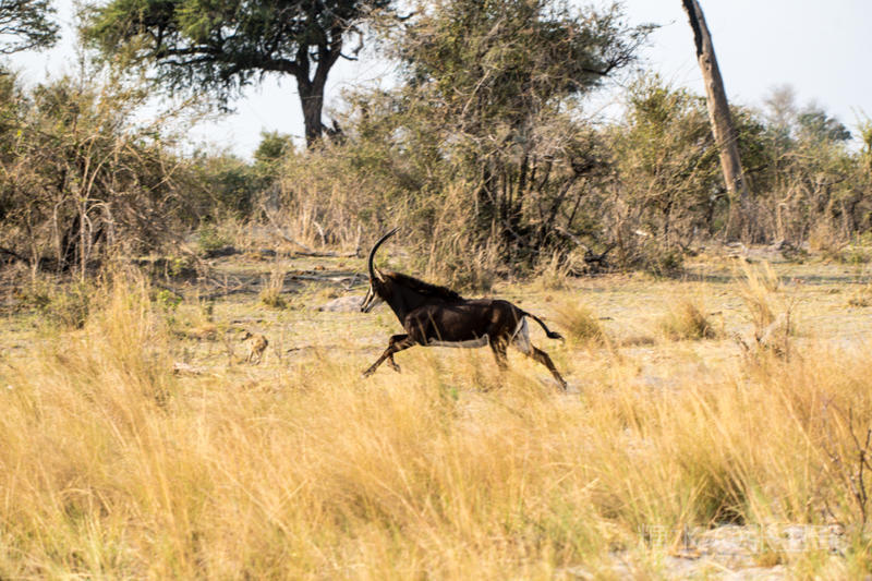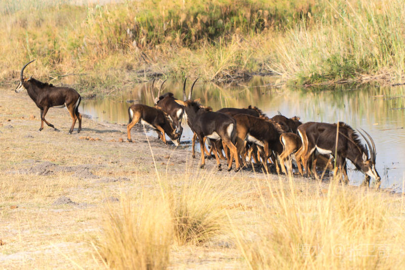 上岸后,我们又改乘敞篷的越野车去寻找野外动物。我们在河边看到一群黑马羚,其中有一头黑马羚在放哨,而领头的黑马羚站在远处,不甘与它们为伍。