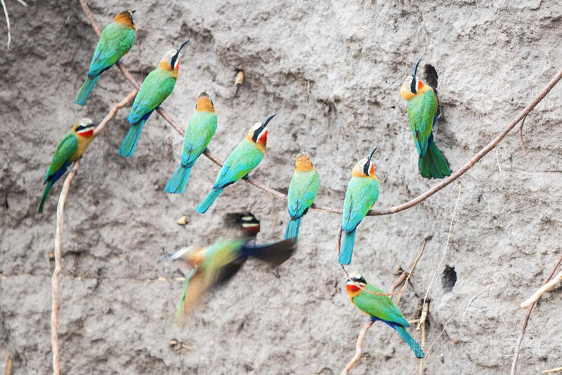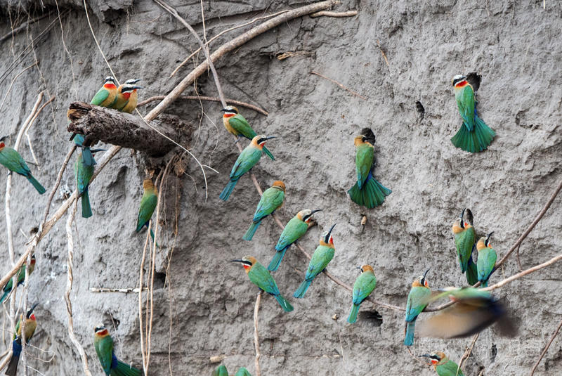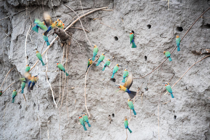 如果你仔细观察,就会在河边的泥坝上发现很多小洞,有点像窑洞。突然间,飞来了很多燕尾蜂虎,原来这些窑洞就是它们的窝,这些父母都飞回来喂食。