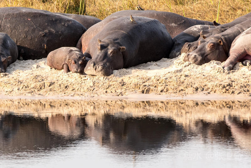 突然,司机停了下来,用手指着河对面。那里躺着三十多头河马,一般河马为了避免太阳的照射,喜欢呆在水里,现在是下午时间,太阳已经不那么火辣了,所以它们都躺在那边晒太阳、打盹!