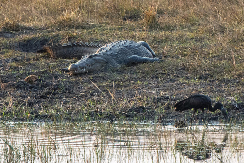 即便在岸边躺着一条鳄鱼,也丝毫不妨碍鸟类在那里寻食。