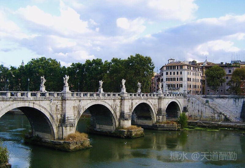 圣天使桥,横跨台伯河的圣天使桥两边有12尊天使雕像,每个天使手上都拿着一样耶稣受刑的刑具。