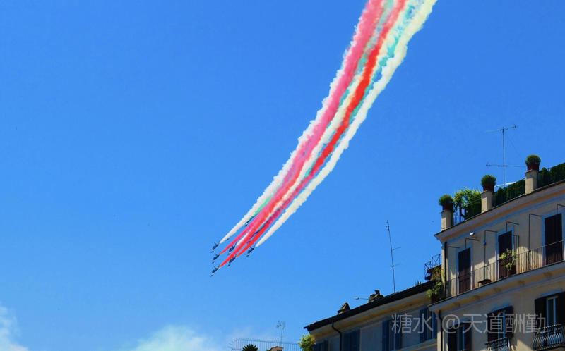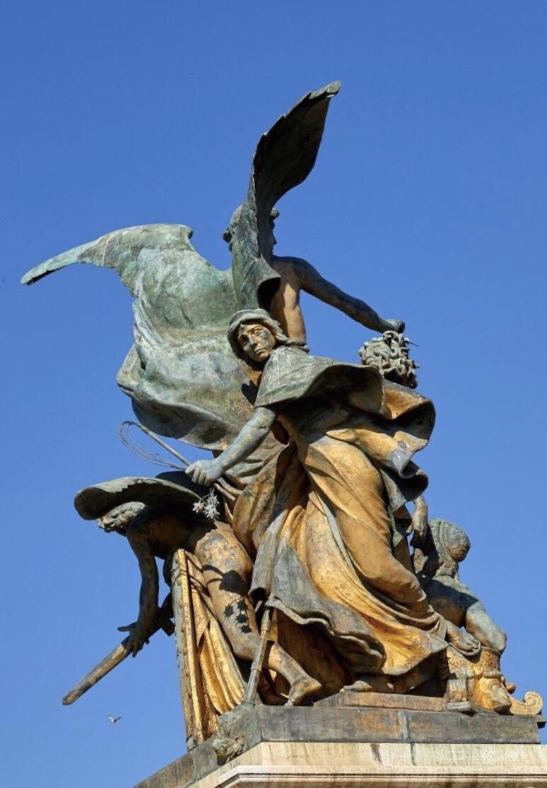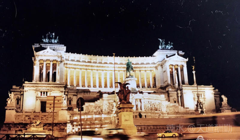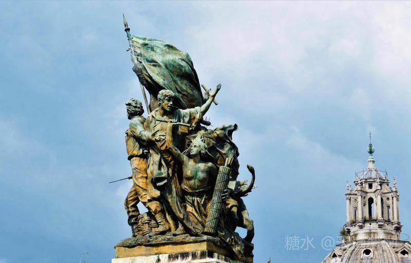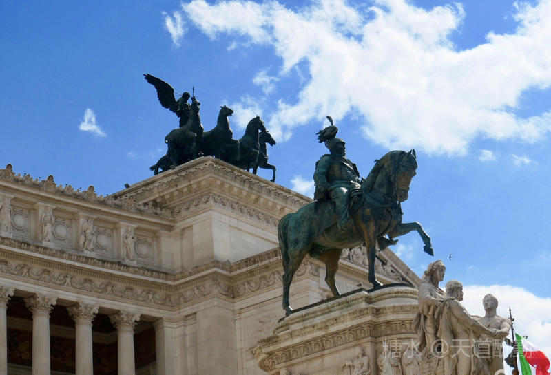 两组喷泉分别象征第勒里亚海和亚德里亚海,中间骑马人物雕像就是完成意大利统一大业的维克多.埃曼纽尔二世。