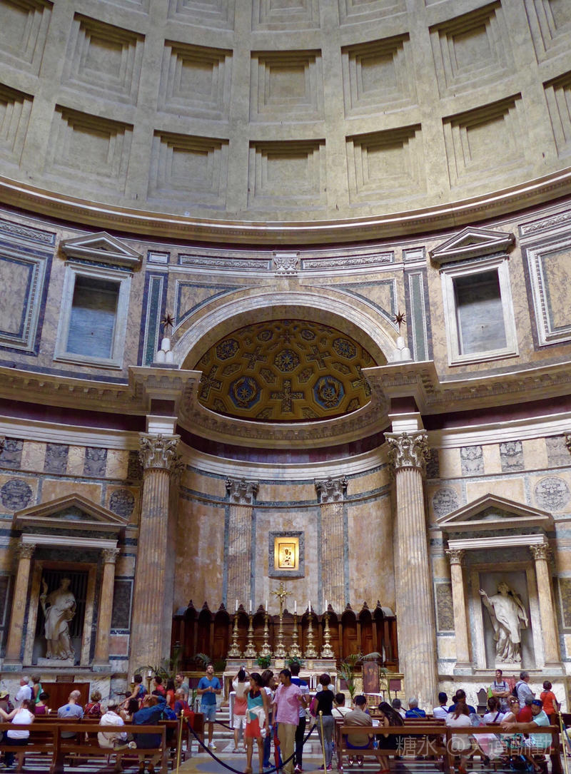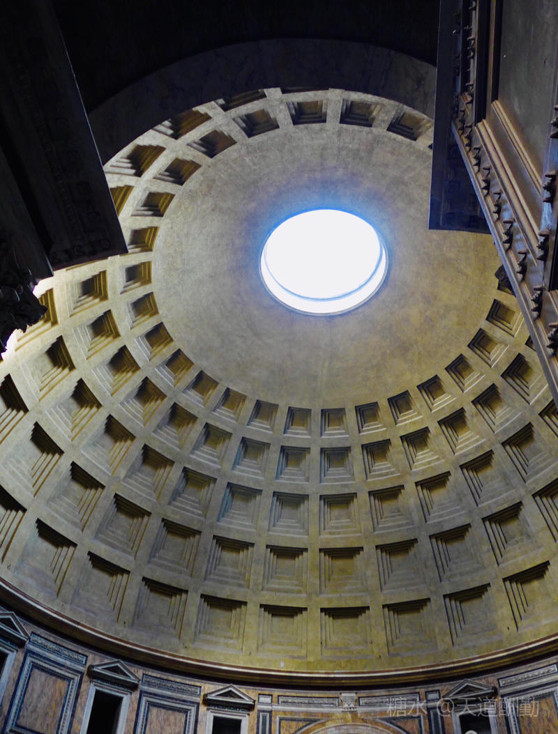 万神殿最为神奇之处在于它的巨大穹顶,巨大的穹顶没有支撑的柱子。直径达43.3米,顶部有一个8.9米的圆形大孔,阳光从顶部照射进来,随着太阳位置的改变,光柱随即产生了一种神圣的神秘感。雨水通过地面水孔排走,巧夺天工,不愧为"天使的设计"。