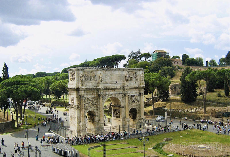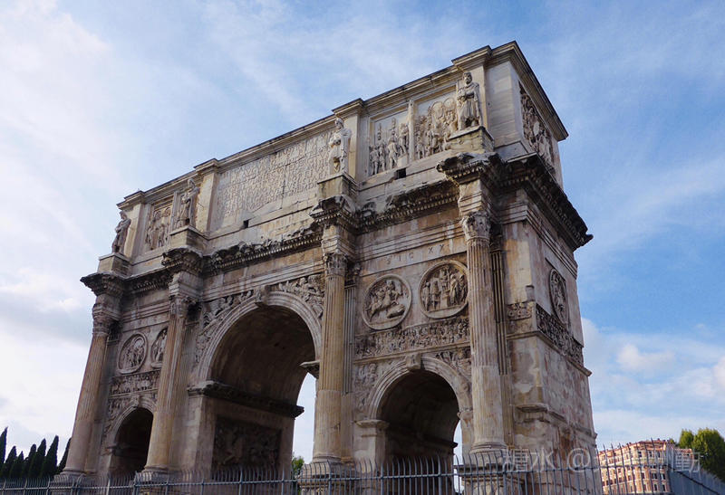 古代罗马时代共有21座凯旋门,现今罗马城中仅存三座。位于古罗马斗兽场西侧的君士坦丁凯旋门建于公元315年,是为纪念君士坦丁大帝击败马克森提皇帝统一罗马帝国而建的。