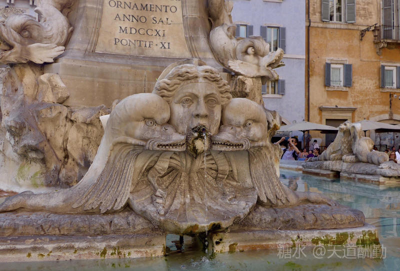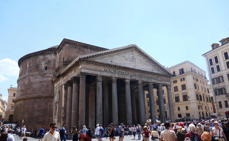 万神殿是古罗马神话中诸神的宫殿,由罗马皇帝哈德良打造,也是为数不多古罗马保存下来的建筑,已经有两千多年的历史,由16根12.5米高的阿林斯式石柱支撑着三角墙,上面刻有宫殿初建时的纪念性文字。