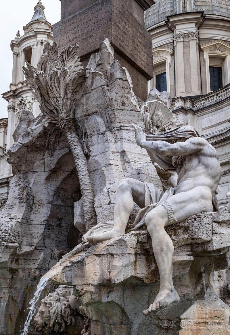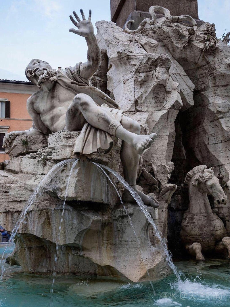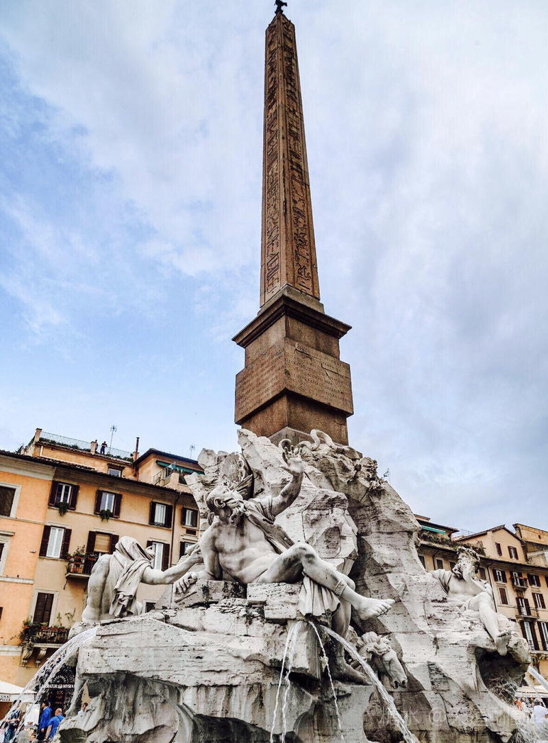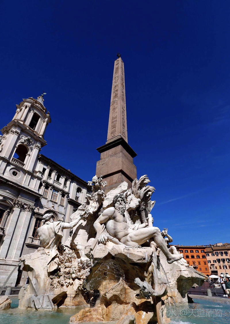 四河喷泉,算得上是贝尔尼尼的巅峰之作。建于1651年,53岁的贝尔尼尼,正处在艺术上最成熟的阶段。雕刻家用四条河流代表四个大洲(亚洲、非洲、欧洲和美洲),矗立在中间的埃及方尖碑顶端有一只鸽子口衔橄榄枝,寓意全世界和平。