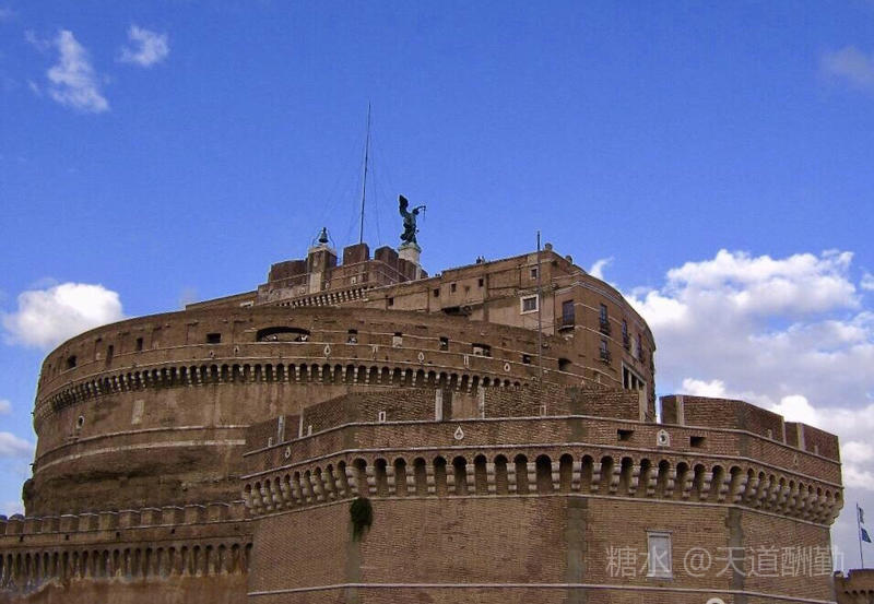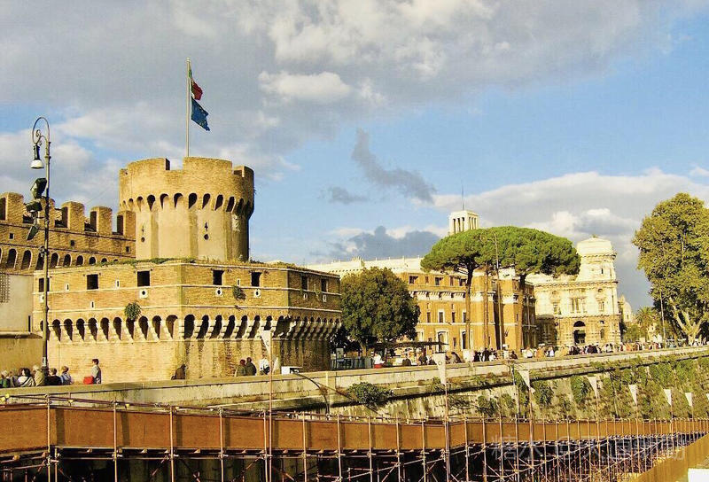 圣天使堡建于公元139年,通过城墙与梵蒂冈相连,当敌人入侵时教皇会沿着城墙上的步道进入城堡。圣天使城堡首先作为阻止西哥特人和东哥德人入侵的要塞,之后被当作监狱使用,最后改建成一座华丽的罗马教皇宫殿,现为国家博物馆。