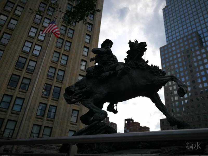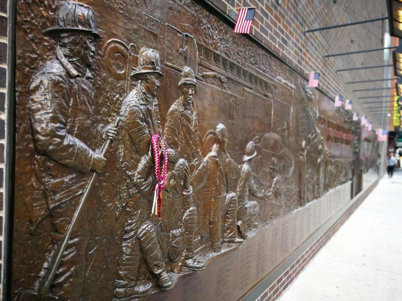我特别注意到公园有一颗在911惨案中幸存的树,树枝如华盖般伸展,可以称得上“树坚强。”公园一侧的入口,排列着斜卧的石块,象征这里的劫后余生,据说是当时的纽约市长布隆博格所捐赠;登上一街之隔的自由公园,这里有废墟中挖出的雕塑,按它损坏的样子陈列;有美国海军陆战队员的塑像,表现的是“犯美利坚者,虽远必诛”!这样的凶悍,在中国大约要追溯到遥远的汉风盛唐年代了。