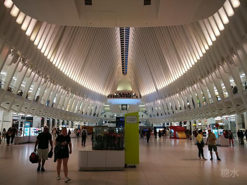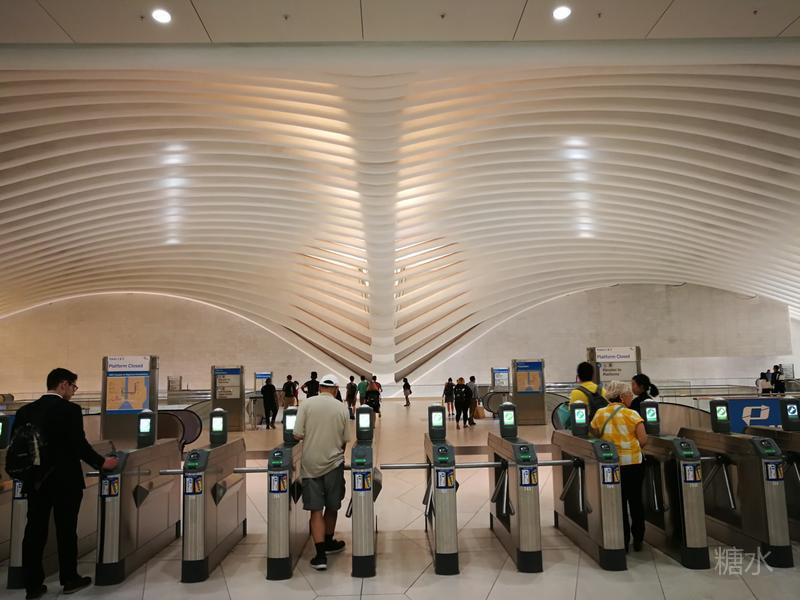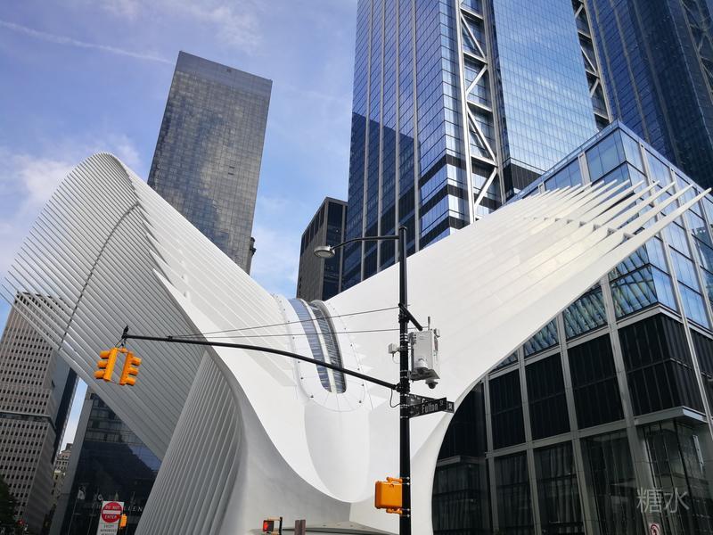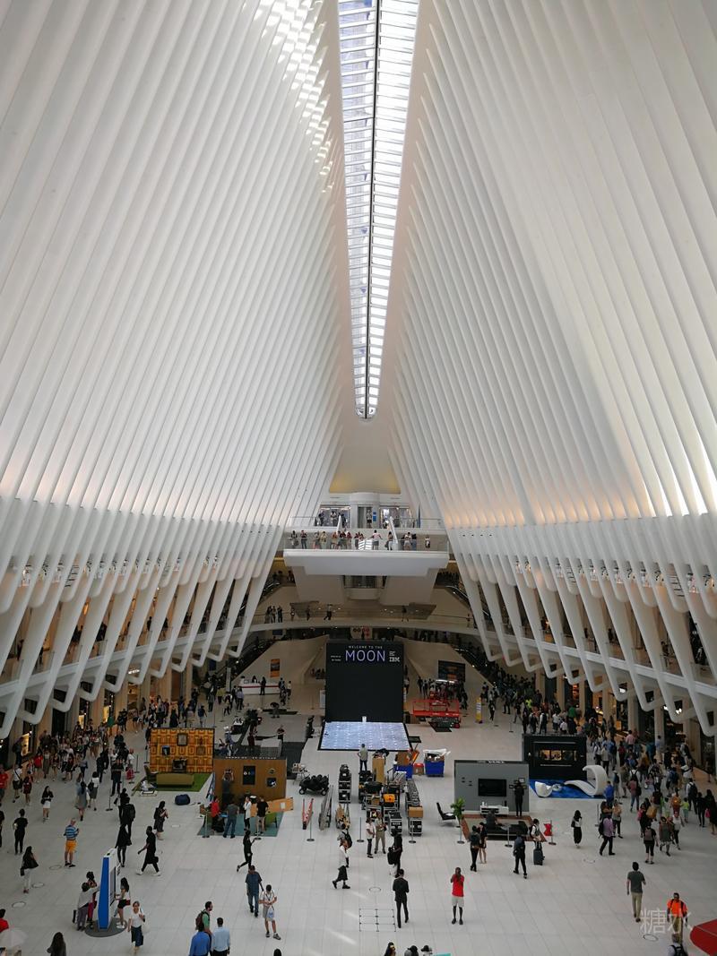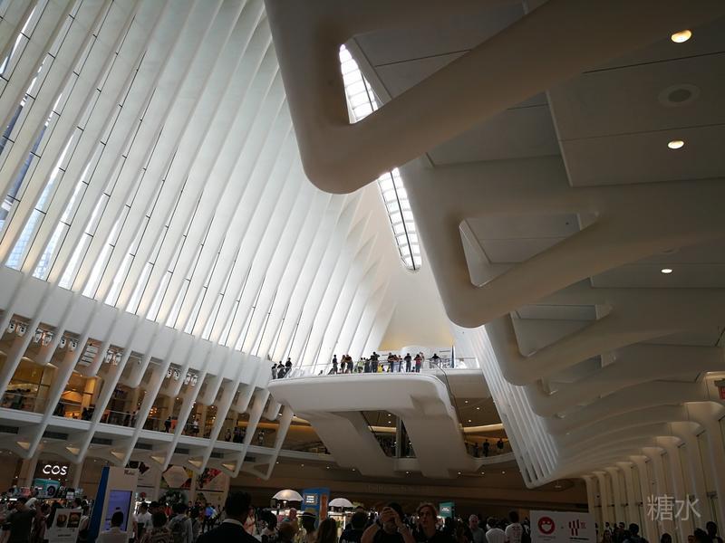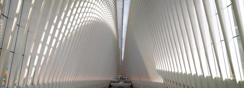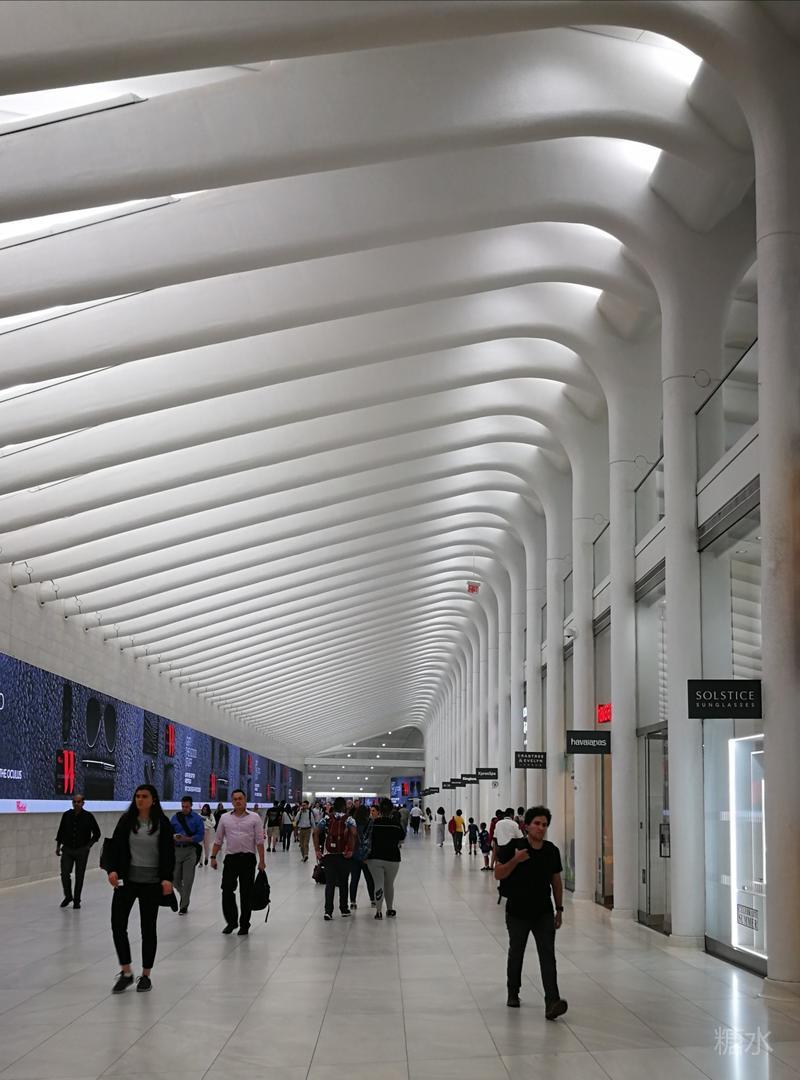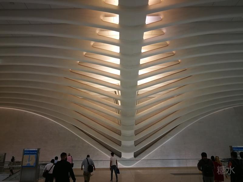从泽西市的Exchange Place坐地铁Path线,只一站就可到达曼哈顿的新世贸中心车站;原来的车站在911事件中化成废墟,新站会是怎样的浴火重生呢?从地铁出口进入大厅,可以看见一个巨大的椭圆形穹顶的白色建筑,顶部空隙处的玻璃可以使阳光照射进大厅,投射在两侧一条条裸露的骨架上;大厅两端的出入口,类似动物尾部的骨架形状对称强烈,又有着高迪设计的影子。这是纽约最大的地铁换乘枢纽,有9条地铁线27个出入口,以及几万平米的商业办公空间,连接周边数十栋建筑。
