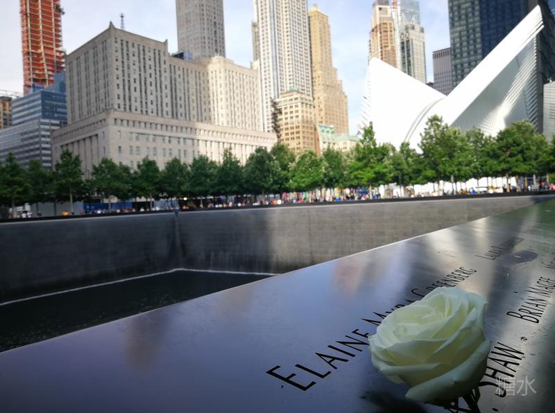 曾经世贸双子塔的地基,两个巨大的深坑,黑色大理石砌成的矮墙,上面是911事件每个死者的名字,名字上方的一朵朵淡黄色玫瑰,代表着当天逝者的生日。水从黑色的四壁流向深坑底部,就像是流向黑洞洞的地狱之门。恐怖分子给了曼哈顿两个深坑和3000多条生命的消失,美国则还以几个敌对国家更大的深渊和数百万人的死亡。