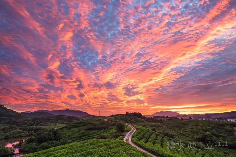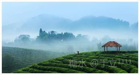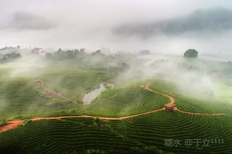 【雾茶园】 之江茶园之江边, 尽得仙露润其间。 翘首一轮红日艳, 俯瞰千层绿梯田。