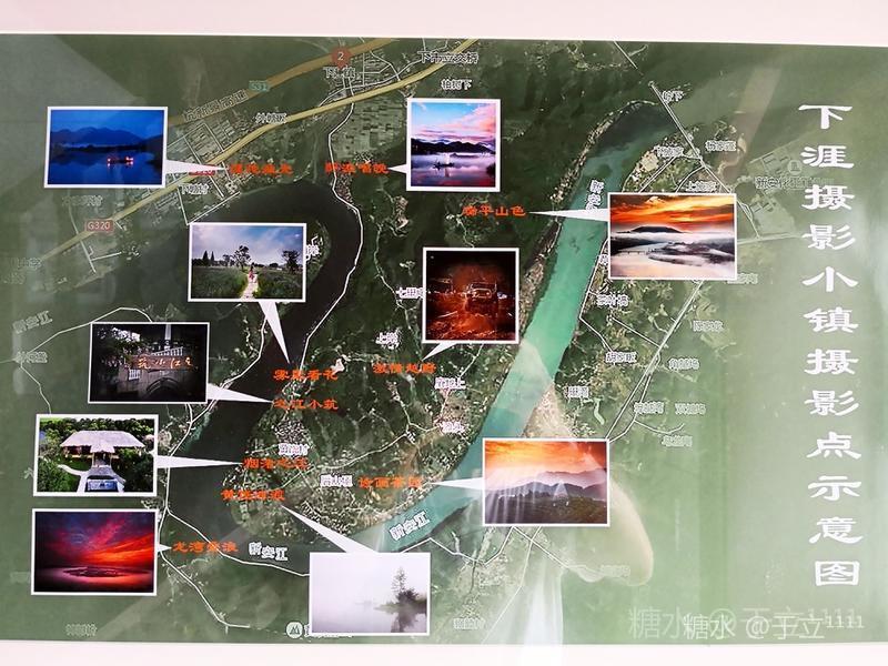 去年我们在小筑内侧面墙上,看到了下涯的摄影点介绍图片,使我们了解到附近共有10处主要摄影点: 它们分别是之江小筑、雾里看花、烟渚之江、诗画茶园、龙湾叠浪、湿地渔光、醉渔唱晚、激情越野、瑞平山色和黄饶津渡。 今年又追加到共20处。这得益于当地政府的大笔投入,已经从新安江水电站开始,沿途陆续修建60多公里的步道和观景平台,通向杭州。