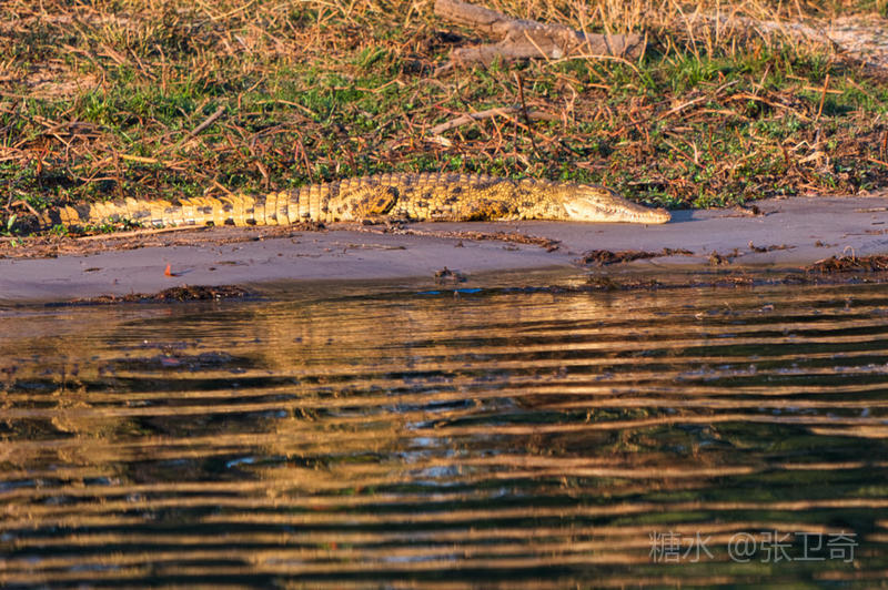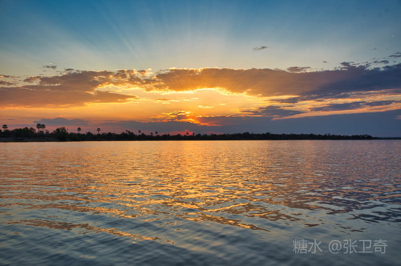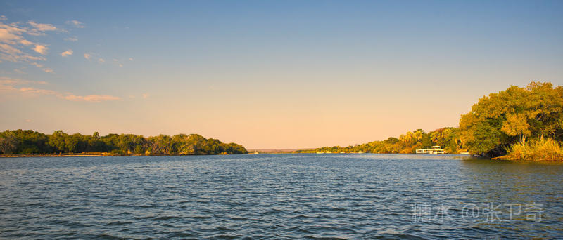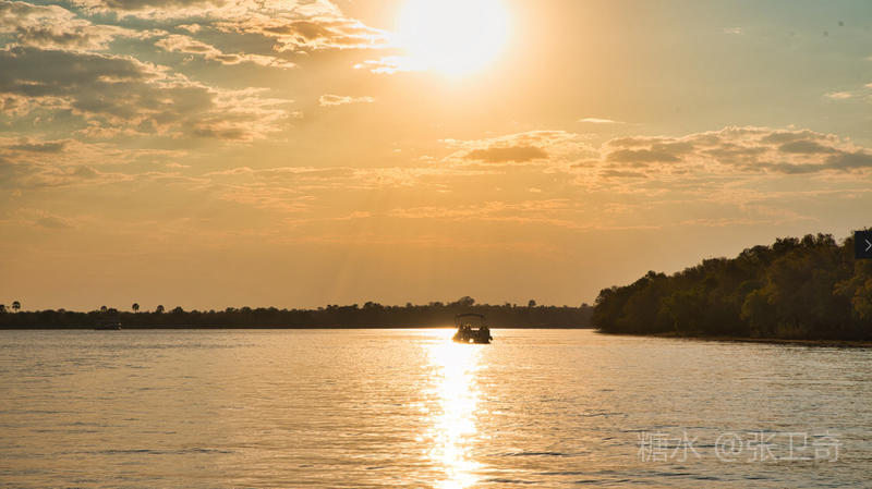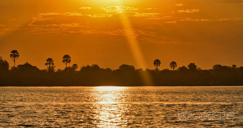 静谧悠然的赞比西河,河面宽阔,水流平缓,河水共长天一色,夕阳毫不吝啬地将全部金辉洒向赞比西河。