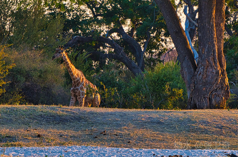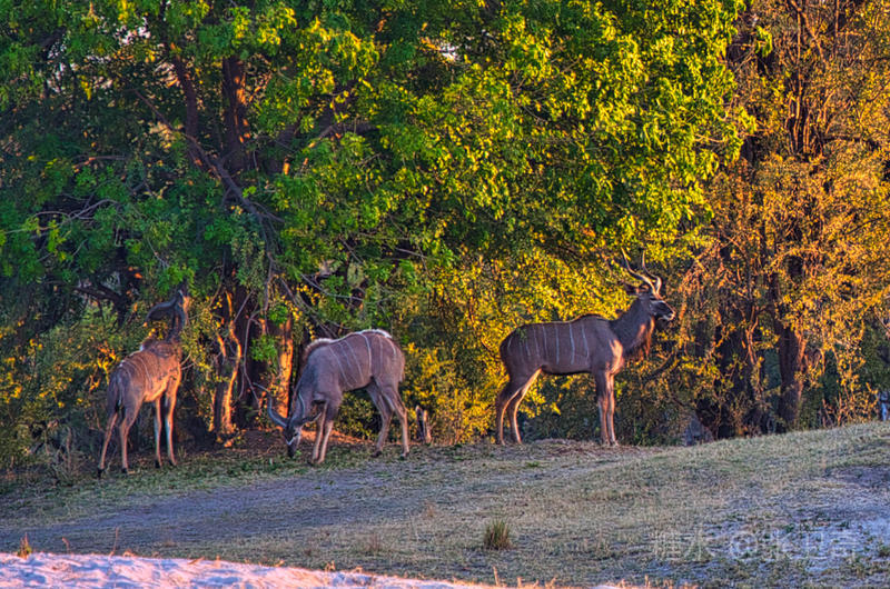 那些羚羊、长颈鹿和大象也都纷纷来到岸边,慢悠悠地喝水寻食,沐浴着夕阳的光芒。