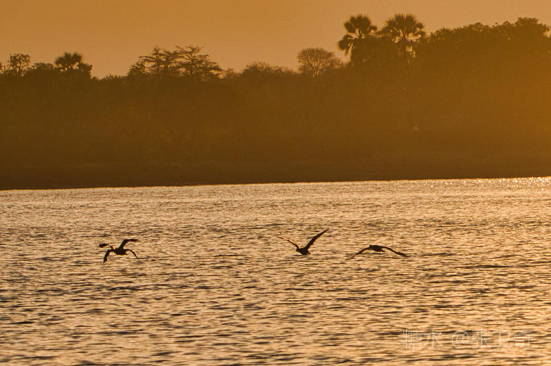 眺望远处,淡淡的水面,如此的和谐,辉映但不缺光彩,几只飞雁乘着夕阳的光辉,展翅在赞比西河上。