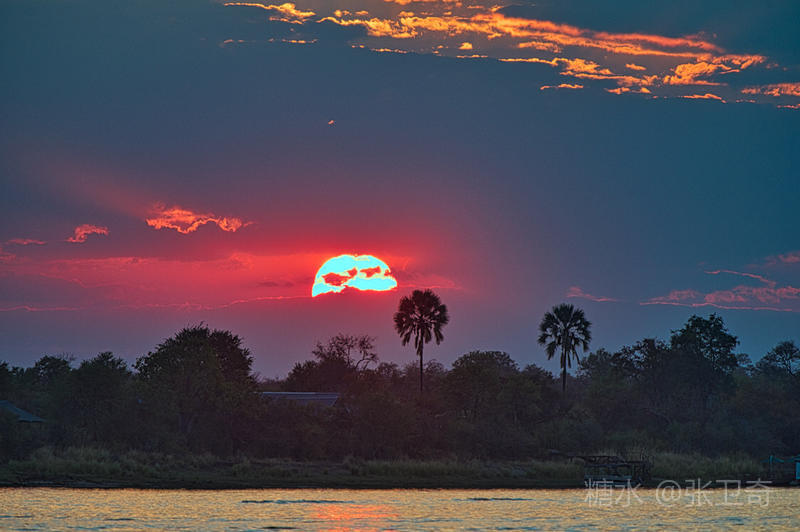 落日的脚下,是波光粼粼的赞比西河,也被染得红艳艳的,仿佛是被浴血的落日浸染。这是太阳那最后的、带血的激情,也许只有此时此刻正沐浴落日的人,才能够真正领受这最后的光明。