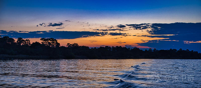 夕阳,慢慢地,沉下了地平线,天空流云溢彩,赞比西河上的水波变得格外分明,茫茫云海好似披上了深蓝色的缕纱,在河边升腾。