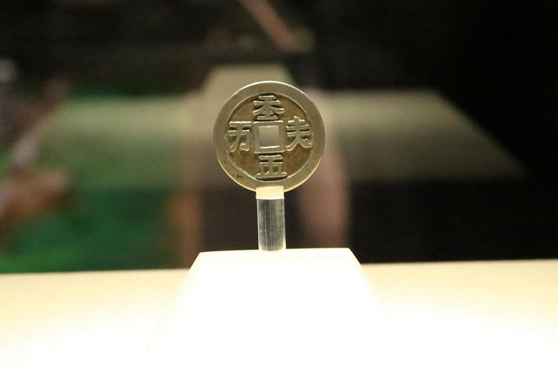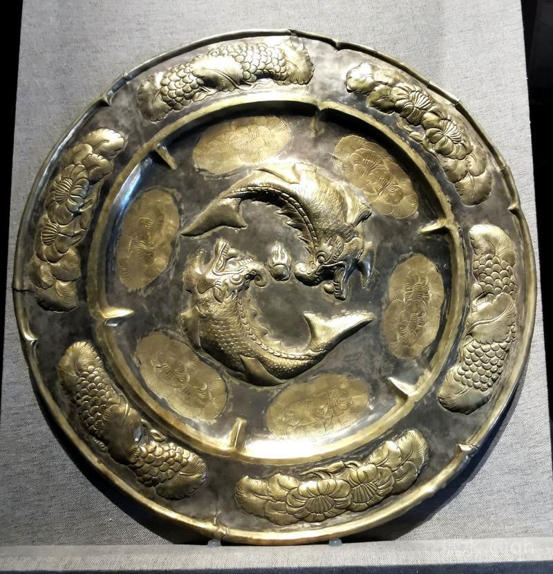 契丹银币(为镇馆之宝),辽代。契丹银币直径4厘米,厚0.2厘米,重21克。辽上京博物馆藏。银钱铸作精致,字迹清晰工整。正刻阳文契丹大字,译为“天朝万岁”,背刻阴文契丹小字。是一枚非常珍贵、具有重意义的典礼性的压胜钱,祝愿天朝(辽朝)万事顺利。这枚银币不是流通的货币,所铸数量有限,当为稀世珍宝,是全国最早发现的辽代契丹大字银币,为研究北方少数民族古文字学、钱币学提供了十分珍贵的实物资料。