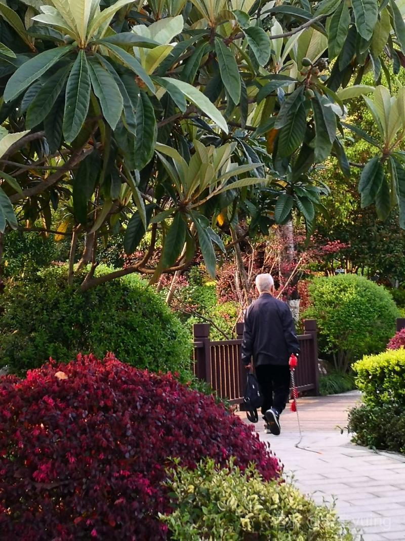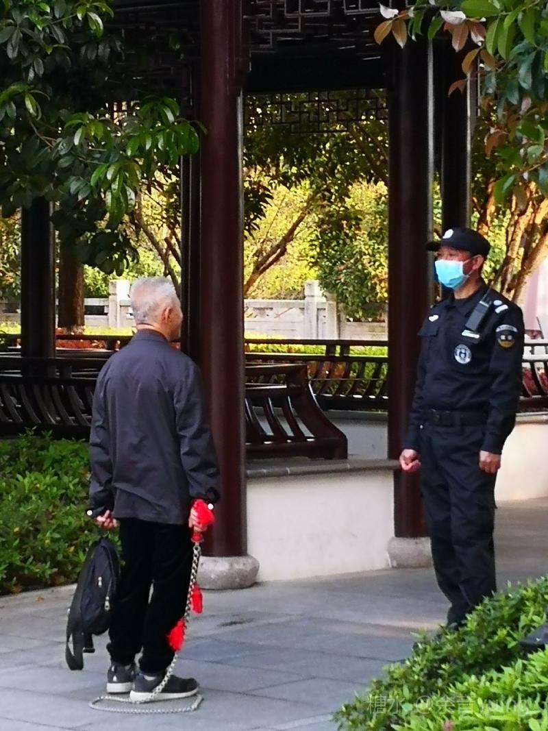 老先生收起功夫,面不改色气不喘,有位廵逻的保安与老先生交谈,这里游人众多,玩这鞭子最好到冷僻所在,注意安全是最重要的。
