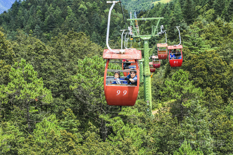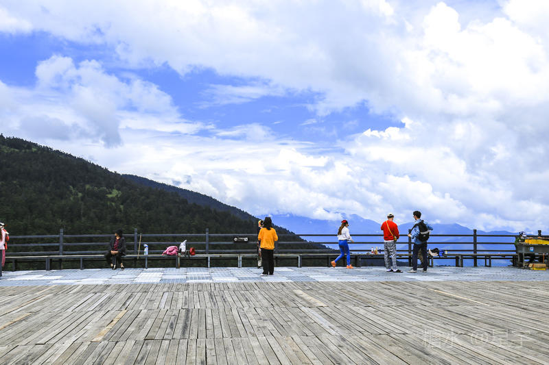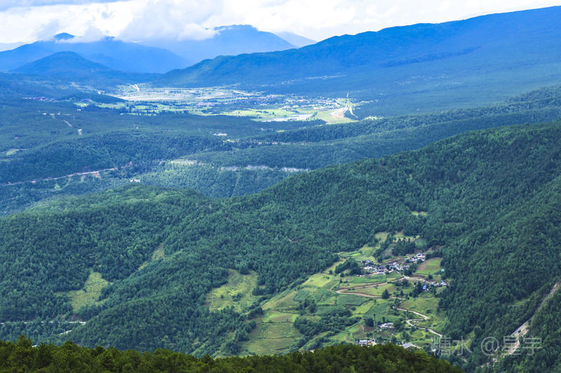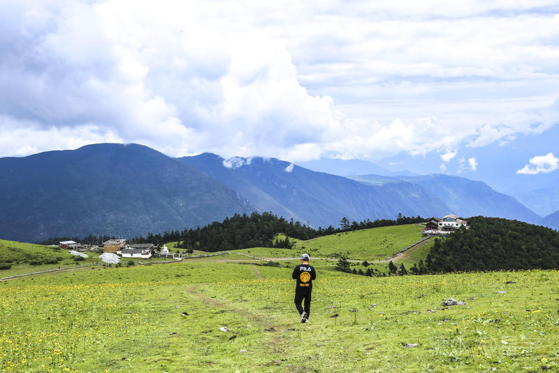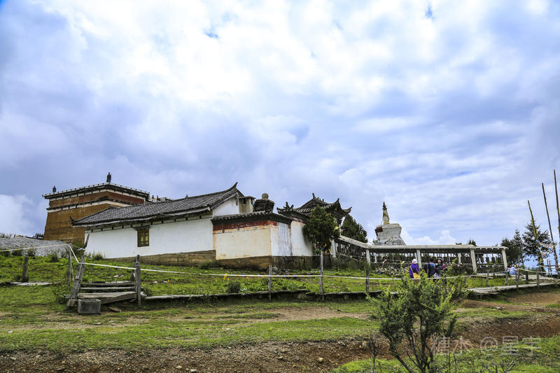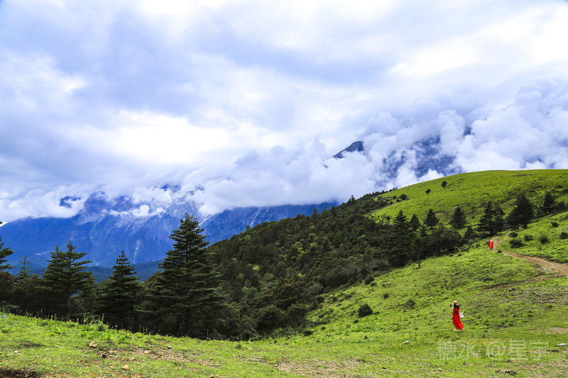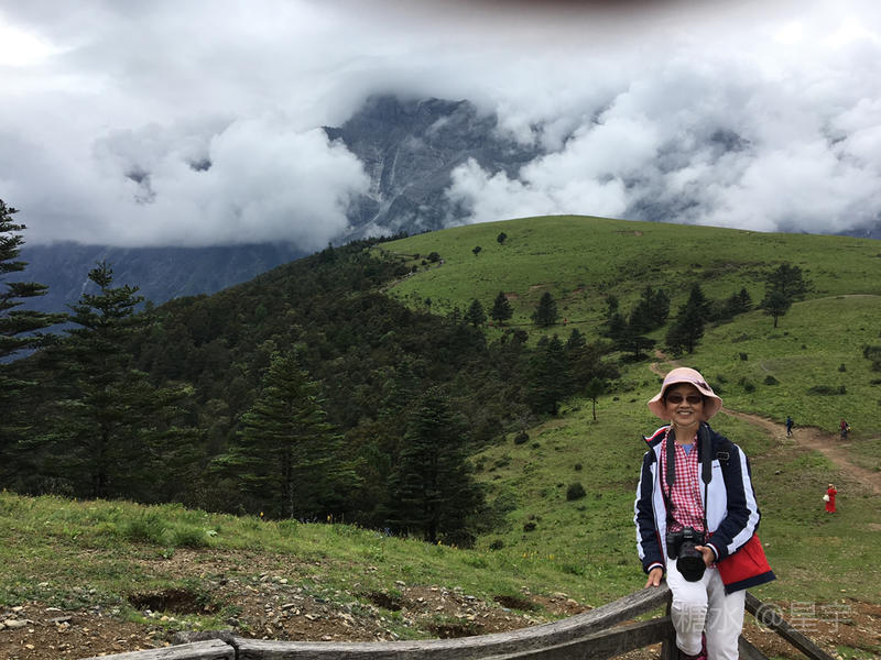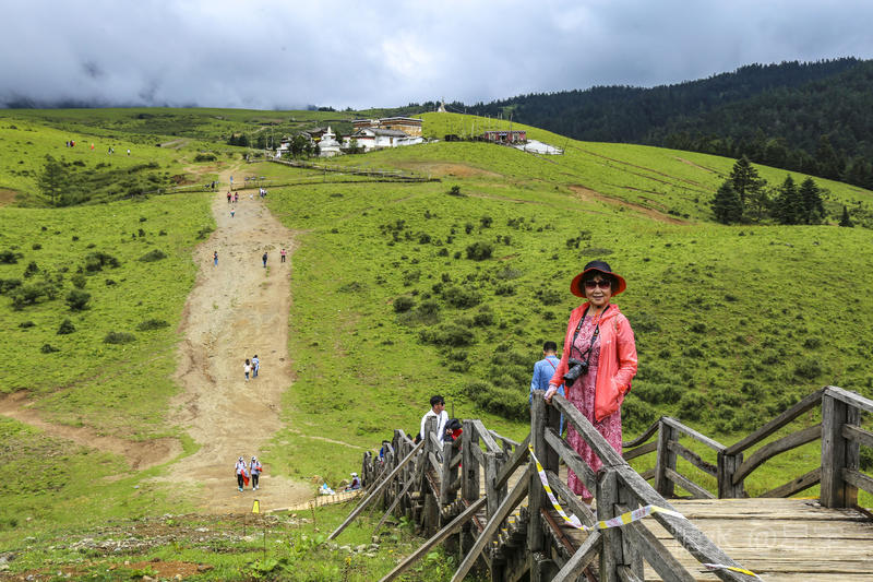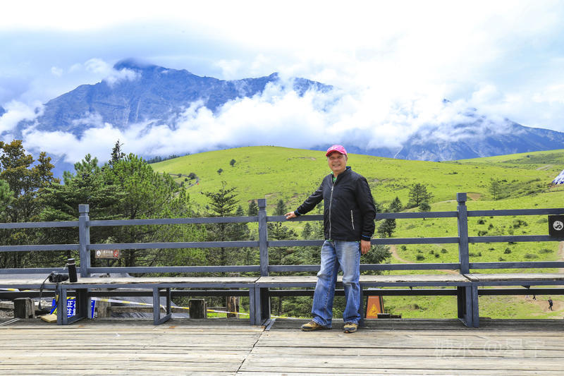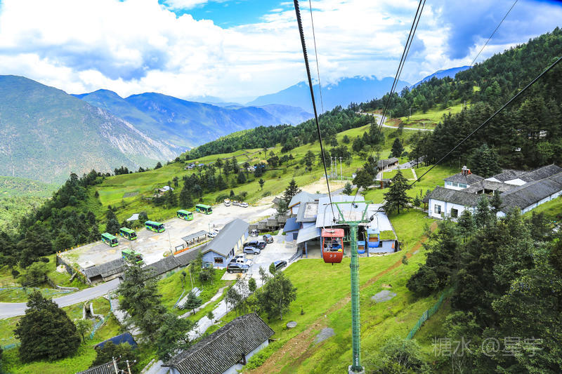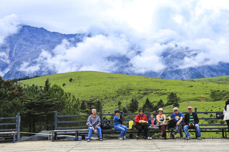 缆车上到一个宽阔的观景台,可以眺望远处的草甸,背后的玉龙雪山,草甸上有一个寺庙,有村民去那里转经。因天气阴沉云层很厚见不到玉龙雪山的全貌。