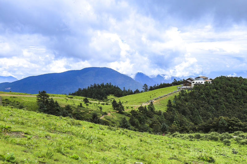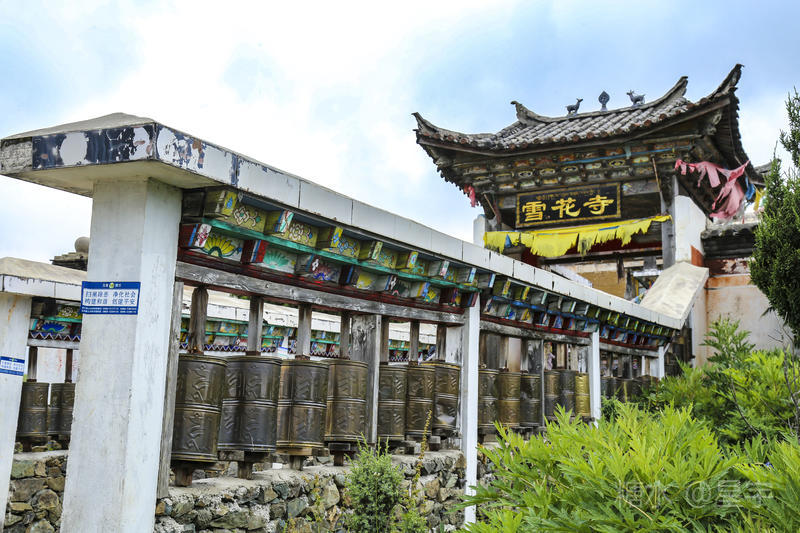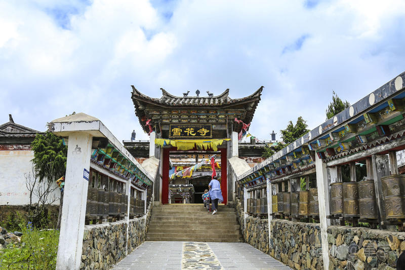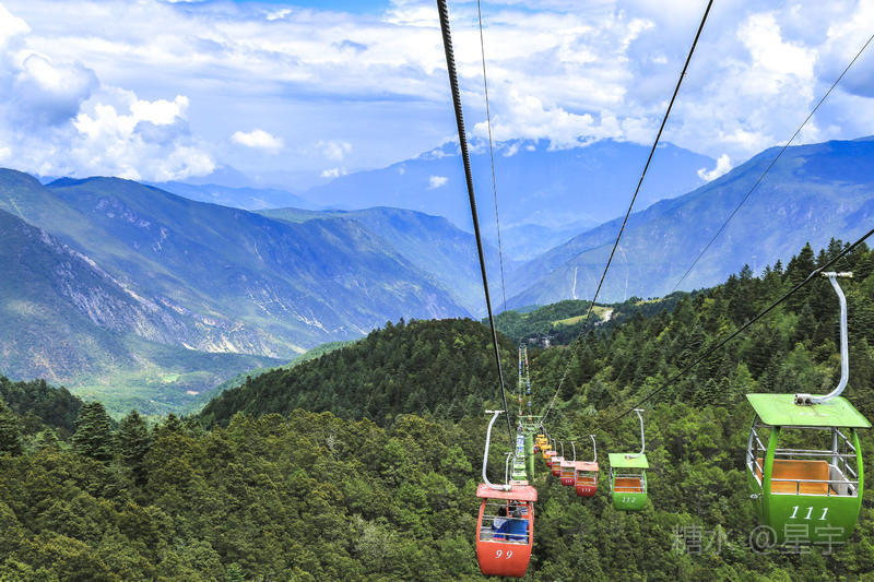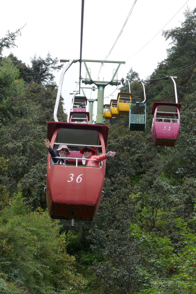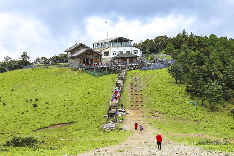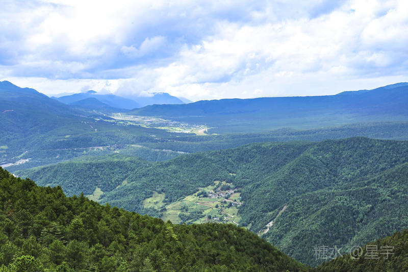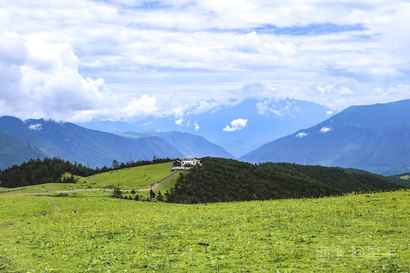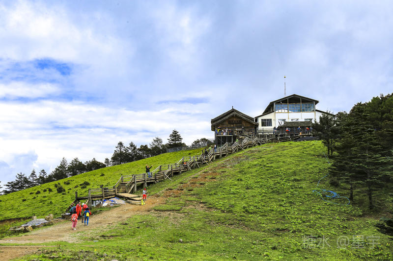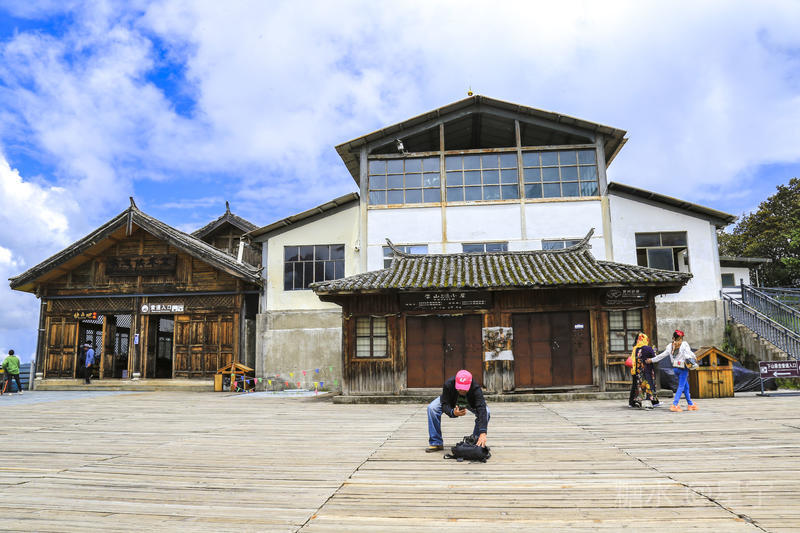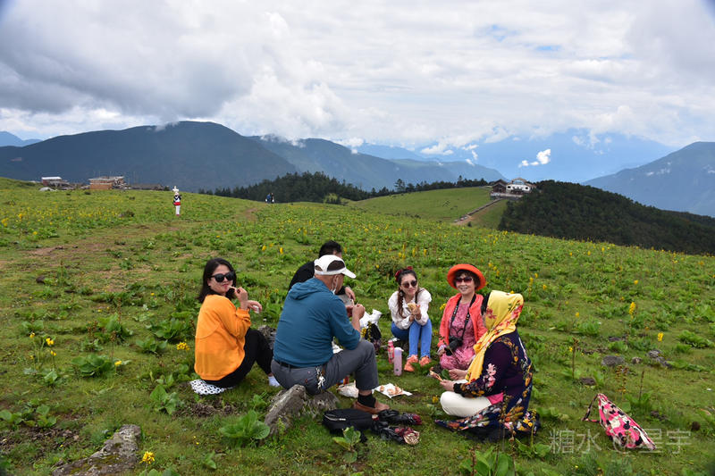 缆车上到一个宽阔的观景台,可以眺望远处的草甸,背后的玉龙雪山,草甸上有一个寺庙,有村民去那里转经。因天气阴沉云层很厚见不到玉龙雪山的全貌。